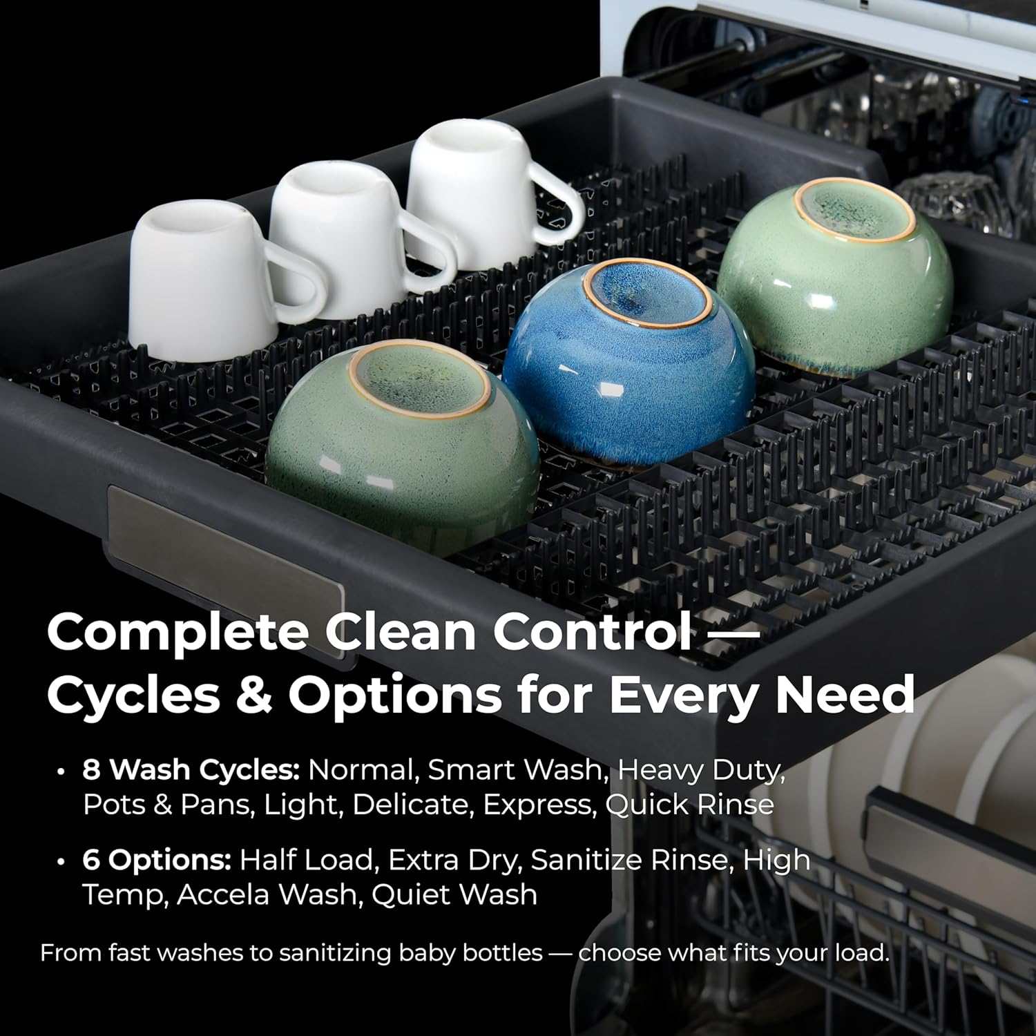 UltraWash Plus Power Cleaning: Three pressurized spray arms clean dishes from every angle using fresh, filtered water. Accela Wash option cleans dishes if you’re in a hurry. No soaking, scrubbing, or scraping needed – just sparkling plates, glasses, and cookware