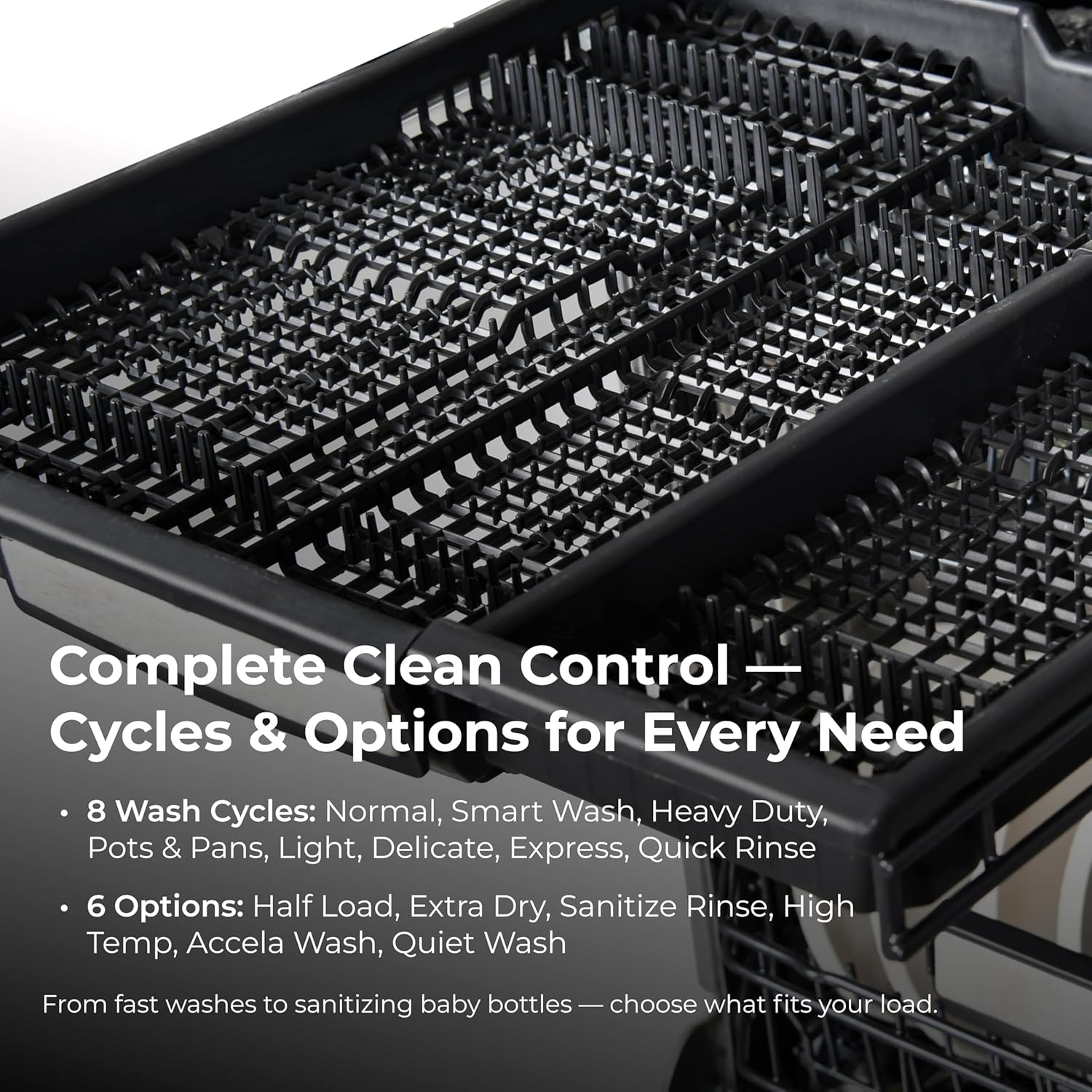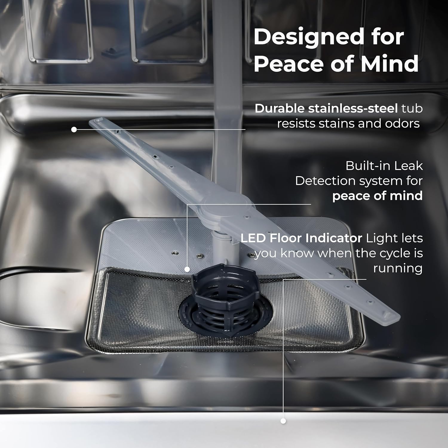 Whisper-Quiet Wash + Smart Features: This dishwasher runs at just 45 dBA, with a QuietWash option for a whisper quiet cycle. LED floor light shows when it’s running, and smooth top-mounted controls add a modern, streamlined touch