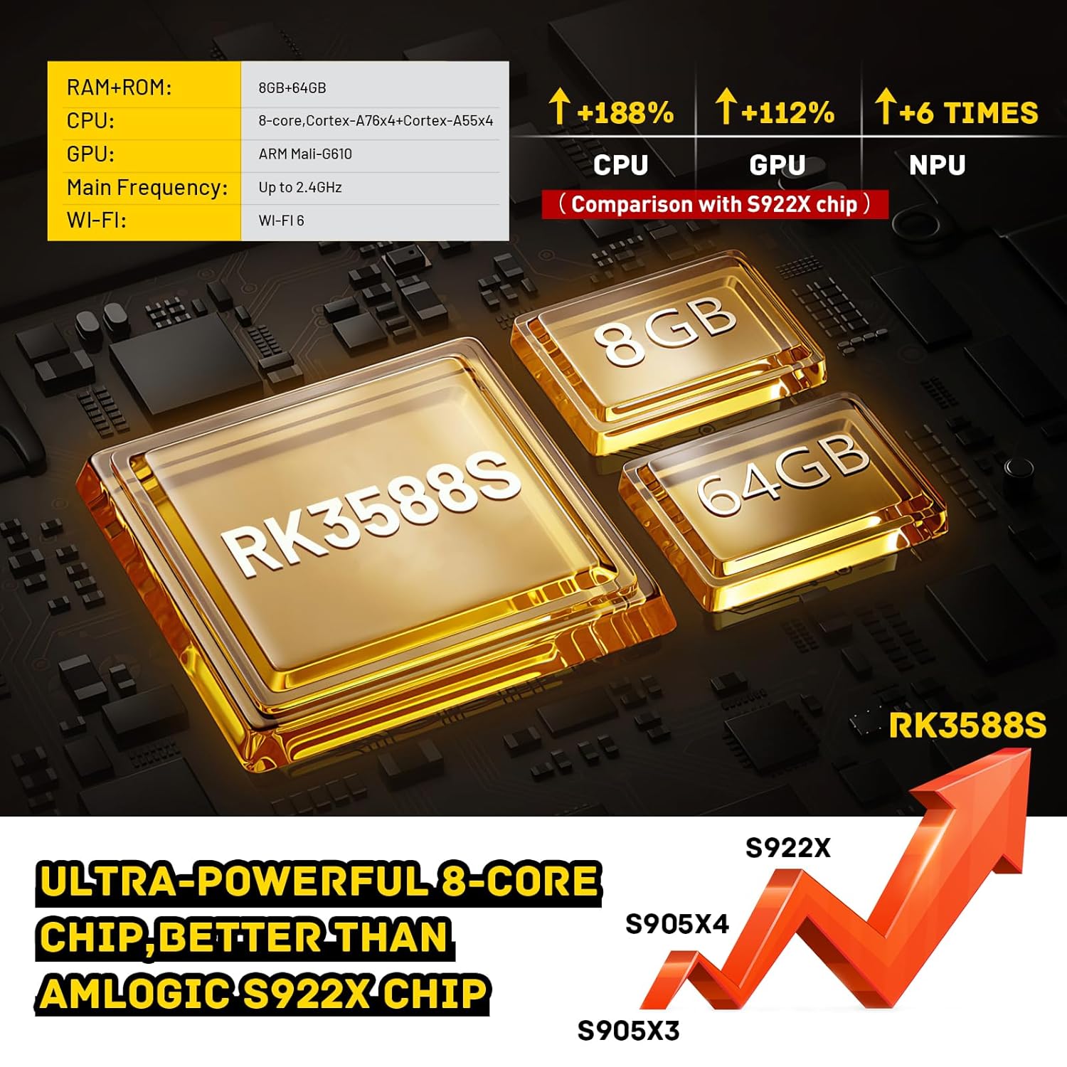 SOC RockChip RK3588S CPU Octa-core 64-bit,4×Cortex-A76+4×Cortex-A55,8nm ,2.4GHz GPU quad-core ARM Mali-G610 MP4, NPU 6 TOPS RAM 8GB/LPDDR4x ROM 64GB eMMC Wireless 2.4GHz+5GHz Dual Wifi 6,BT 5.0 Ethernet 1000Mbps (RJ45 ) Video Output 1 × HDMI 2.1(8K@60fps or 4K@120fps), 1 × DP1.4(8K@30fps) Audio Output 1 × 3.5mm (Support Mic ) ,1 × HDMI 2.1,1 × DP1.4 Inerface 3 × USB3.1,1 × USB2.0,1 × type-c, 1 × STAT 3.1 Power Supply DC 12V (DC5.5×2.1mm)