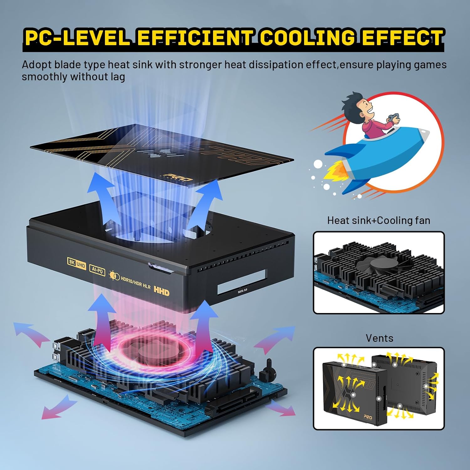 【Advanced Cooling System】A built-in silent cooling fan activates during use, maintaining optimal temps (40–60°C / 104–140°F) to prevent overheating, frame drops or lag—guaranteeing smooth gameplay and movie nights.