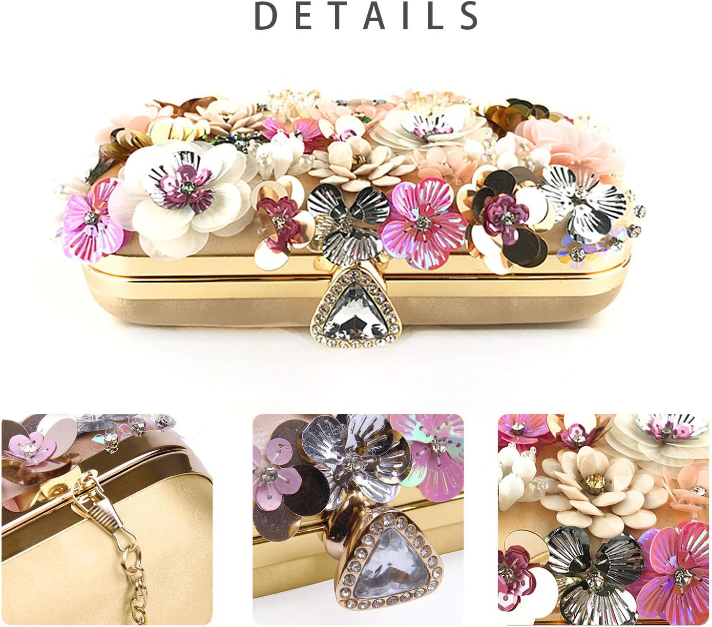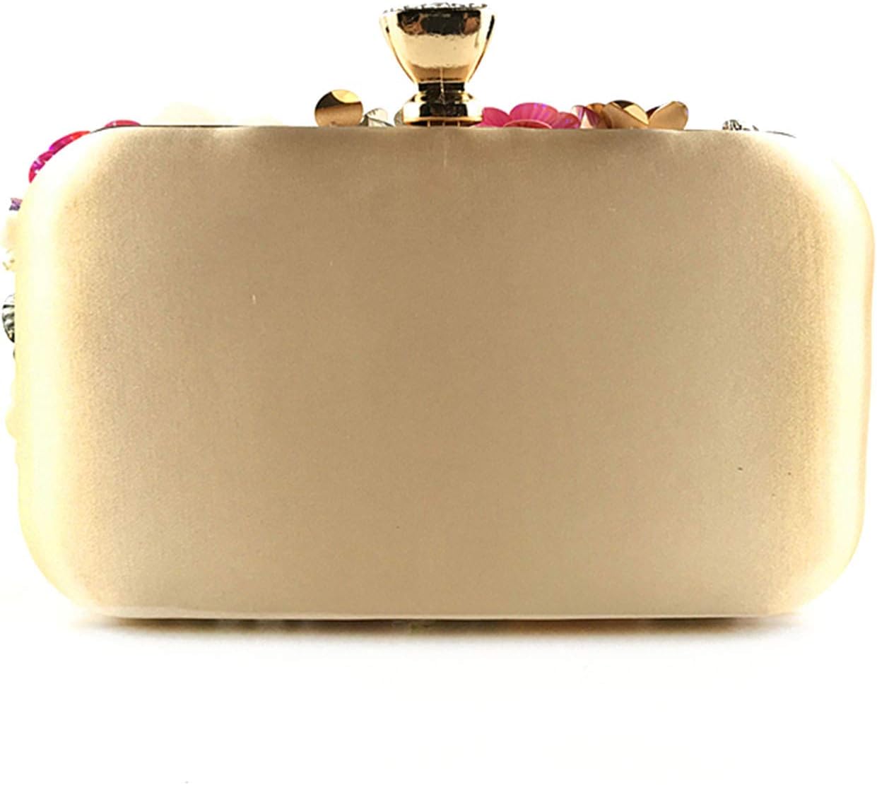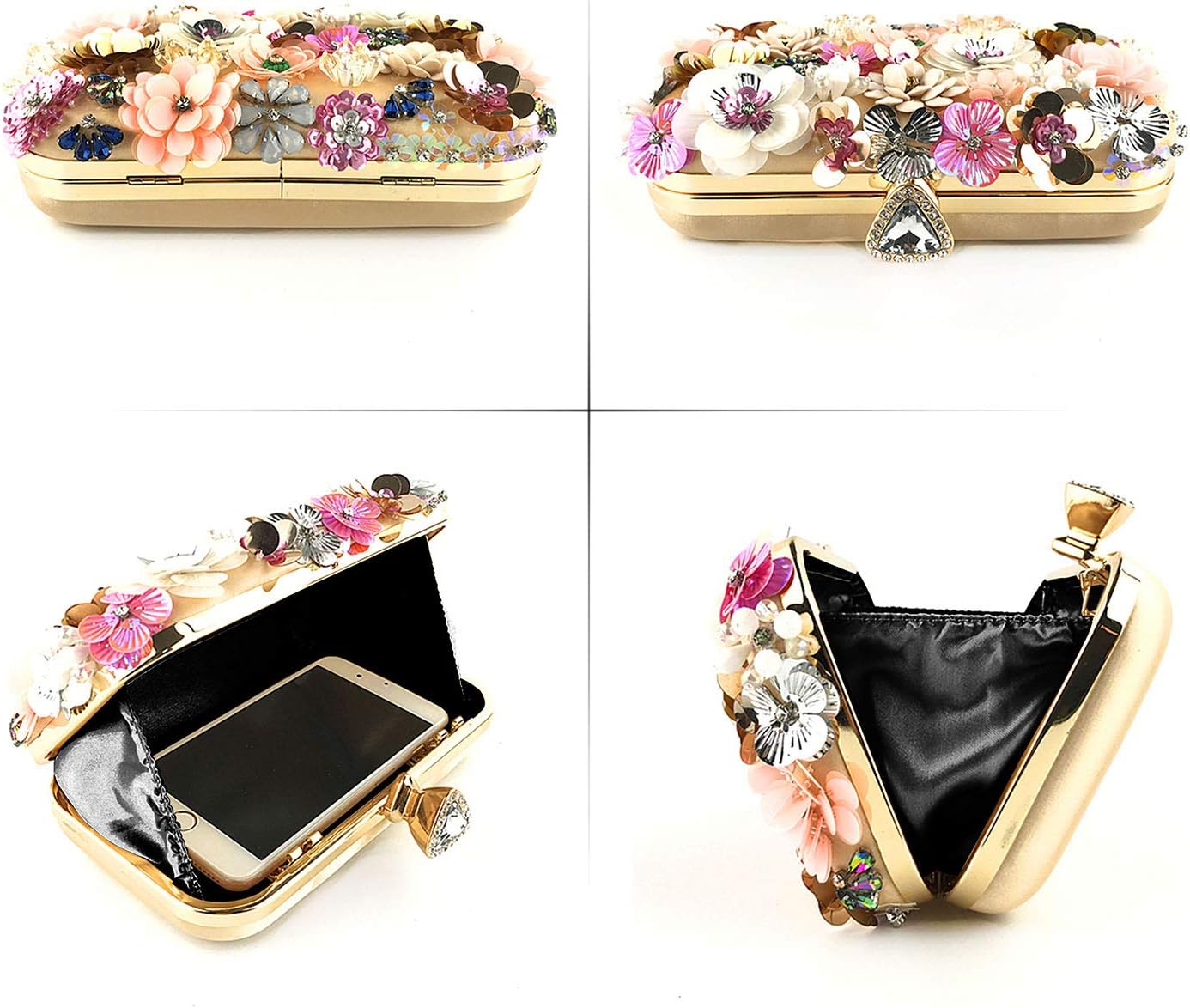 Top Sparkling triple diamond clasp closure with rhinestones.It is easy to open and close.The variety hand-sew flowers on the surface are consist of different shape of pearls, colorful sequins and embellished by glitter beadeds, not easy to fall naturally.The entire structure is made of superior hardware frame construction, the whole fabric material is smooth satin, feel comfortable.