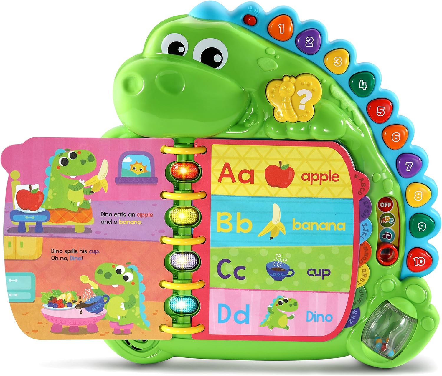 Learning the ABCs is a great way to spend the day! Read about Dino’s day while learning the alphabet in Dino’s delightful day book.Letters and words are woven into the story in alphabetical order with phonetic sounds to introduce ABCs to your little one through a charming tale. Flip through the 16 interactive pages to hear the story read aloud, or enjoy musical play by jamming to a melody with fun sounds and musical notes. Press the light-up button to hear letter names, letter sounds and words from the story. Number buttons along Dino’s back introduce counting and recognizing numbers from one to ten.This complete story with beginning, middle and end exposes your child to early reading skills. It’s a great day, from a to Z! 2AA batteries are included for demo purposes, replace new batteries for regular use.