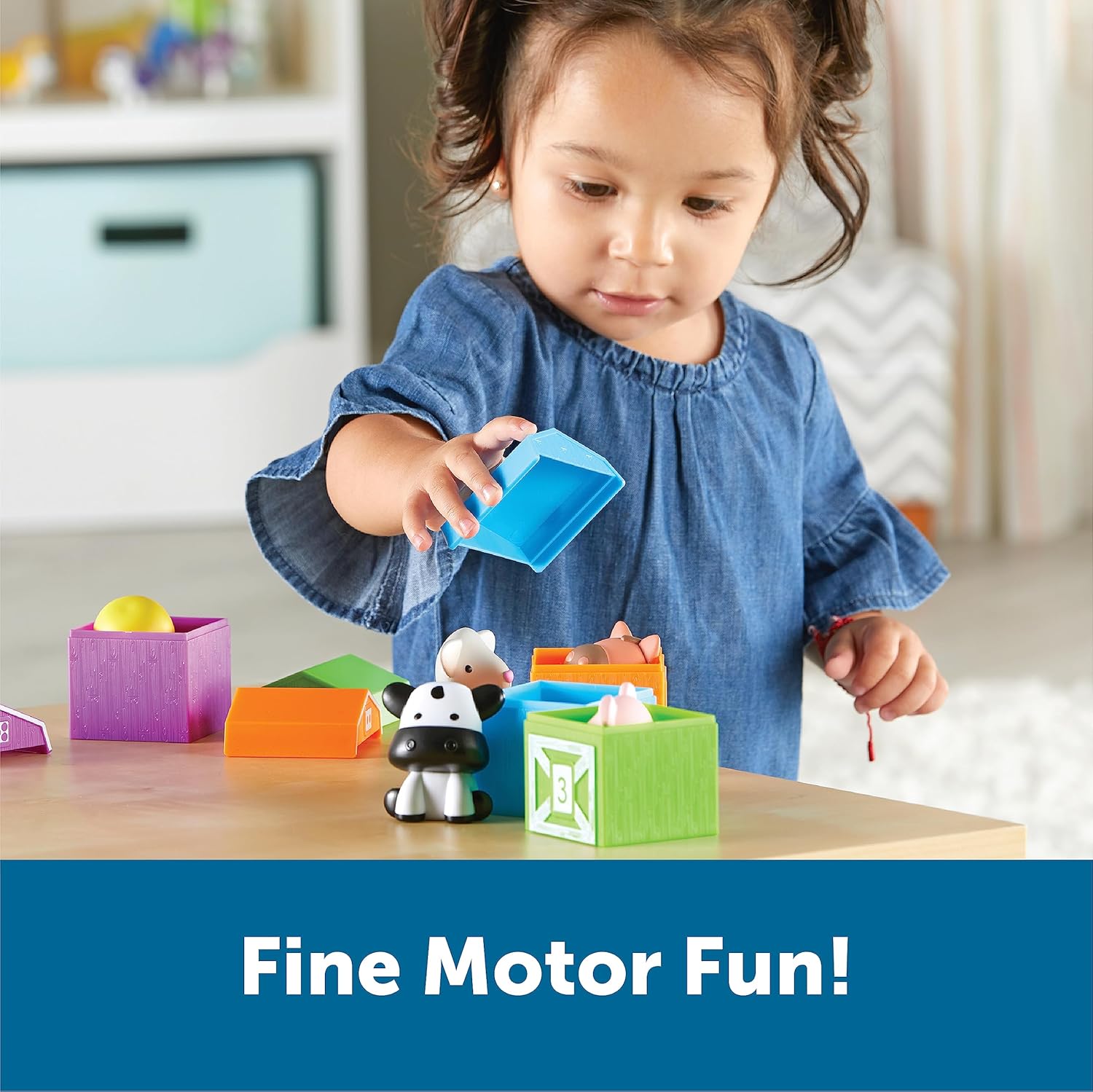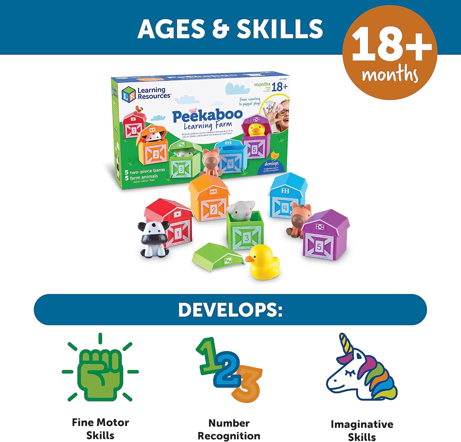 Discover a world of farmyard fun and learning with the Peekaboo Learning Farm from Learning Resources! This versatile set features five colorful, numbered barns that open to reveal adorable animal finger puppets inside. Perfect for little hands, these durable two-piece barns help develop fine motor skills as children open and close them while finding their farm friends. Each barn comes in a vibrant color (red, orange, blue, green, and purple) with matching numbers, creating multiple learning opportunities from color recognition to counting. The sturdy animal finger puppets—including a cow, pig, chicken, and more—inspire imaginative play as children create their own farm stories or put on puppet shows. What makes this toy exceptional is how it grows with your child, starting with simple peek-a-boo games for babies and advancing to sorting, matching, and early math concepts for toddlers. Parents and educators love how this toy keeps little ones engaged for extended periods while teaching essential skills through play. Create memory games, practice counting, or simply enjoy watching your child’s delight as they discover which animal is hiding in each barn! The perfect size for small hands and made from high-quality materials that withstand enthusiastic play, this farm set makes an ideal gift for birthdays, holidays, or any special occasion. Give your child the gift of learning disguised as pure farmyard fun!
