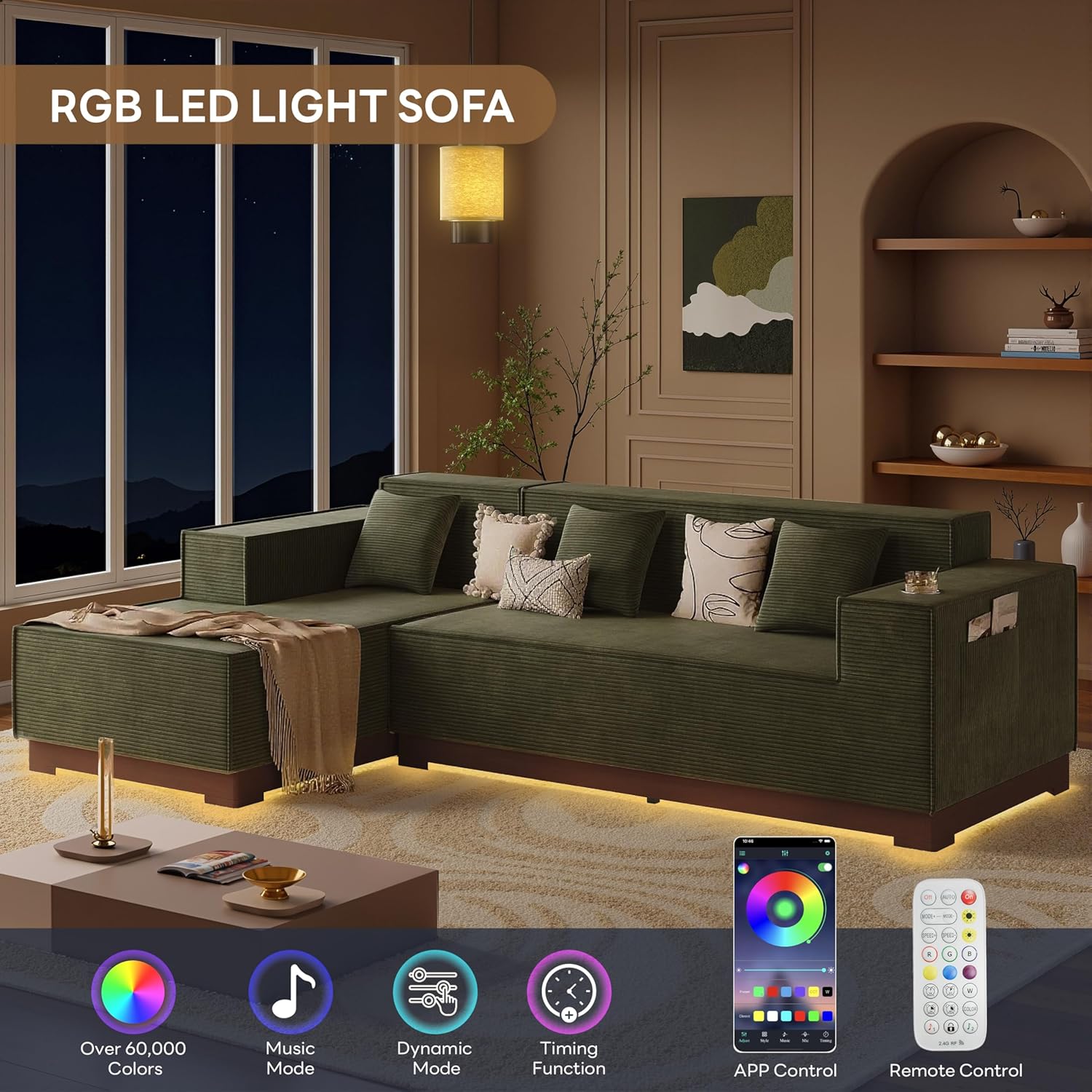 Smart RGB LED Lights: Enhance your ambiance with smart LED lights installed under your sofa. Control them effortlessly via REMOTE or mobile APP with over 60,000 colors to choose from. Explore various modes including Style Mode, Music Mode, Microphone Mode, and Timer Function to create your own unique light shows.