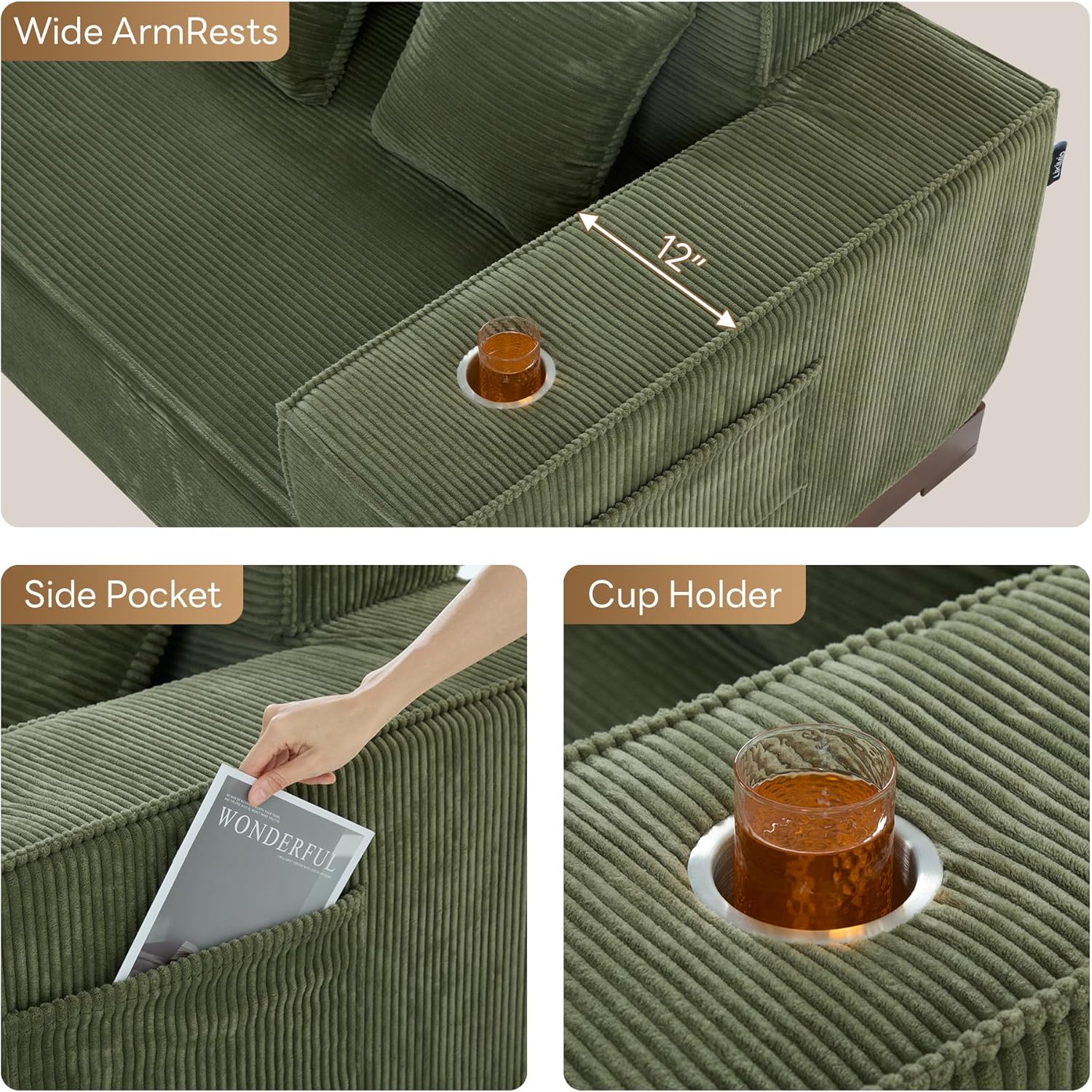 Cup Holders & Storage: Where practicality meets style! Built-in cup holders prevent spills while the side pocket organizes remotes and snacks. Enjoy a tidy, comfortable space effortlessly.
