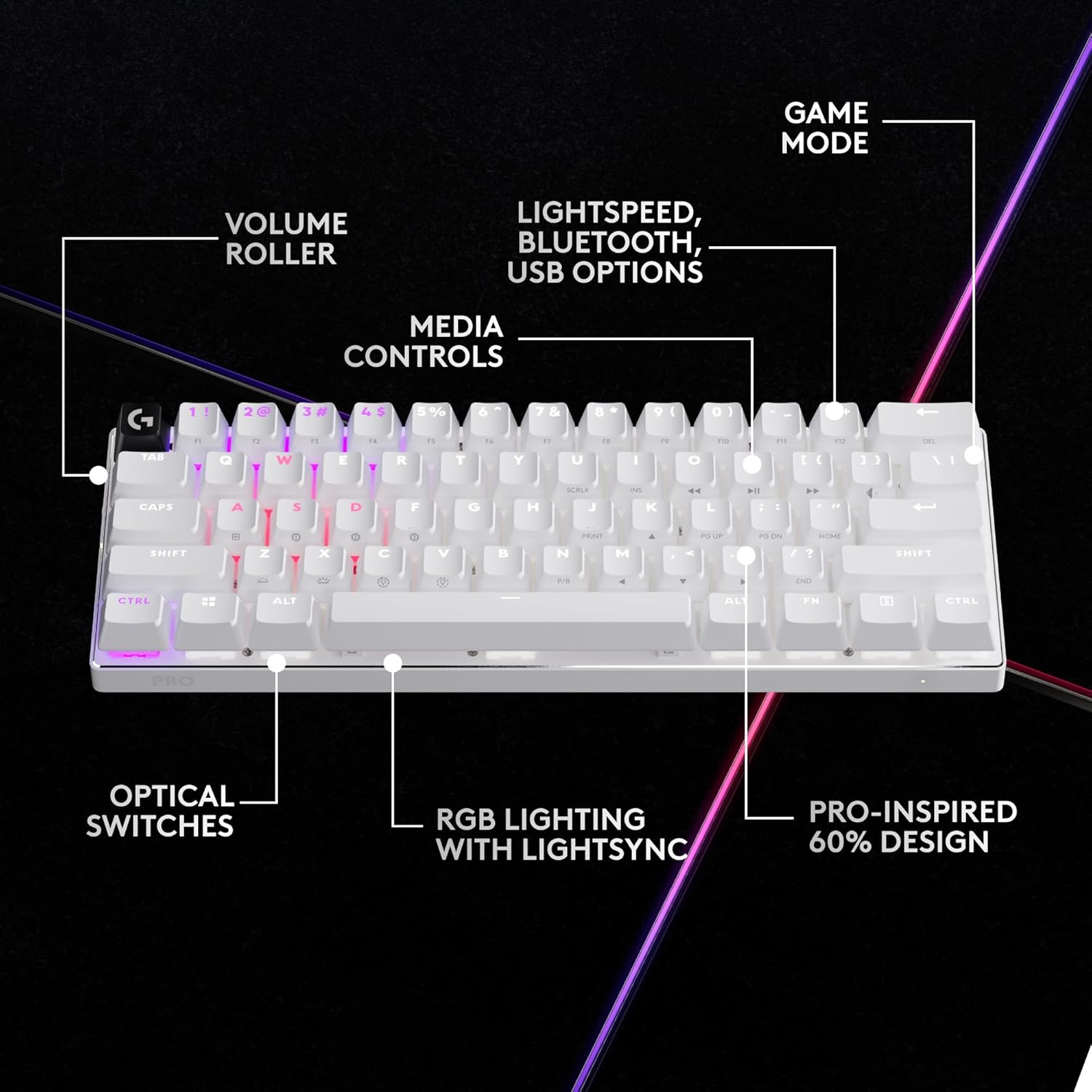 Designed with input from hundreds of the world’s top esports athletes, the PRO X 60 LIGHTSPEED wireless gaming keyboard is Logitech G’s first 60% keyboard. Take control of every key in G HUB with KEYCONTROL and 5 customizable layers for the ultimate command center. Play your way with dual-shot PBT keycaps and two GX optical switch options: tactile or linear. Seamlessly connect your wireless mechanical keyboard using Bluetooth or USB, or unleash speed and reliability with the trusted performance of LIGHTSPEED wireless. Win in style with LIGHTSYNC customizable RGB and 3 keyboard colorways: Black, White or Pink. Compact control. Zero compromises.