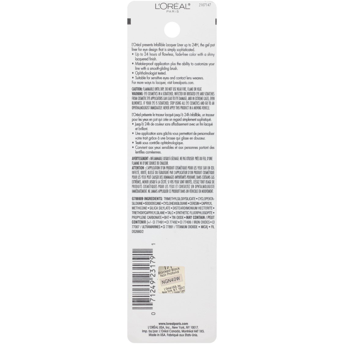 Longwear Infallible Gel Lacquer Liner 24HR glides on smoothly for precise lines and designs. Create sophisticated and long lasting eye looks with smooth gliding brush and gel pot liner. This gel formula keeps a unique lacquer finish that will last all day and night. • High-shine lacquer shine finish • Gel formula for smooth application • 24HR long wear • Flawless, fade-free wear Apply along lash line starting from inner corner of eye working outwards. Eye cosmetics in a scratched, infected or irritated eye and scratches from cosmetic eye applicators can lead to eye damage, and in extreme cases, even blindness. If your eye is scratched, stop using all eye cosmetics and go to an ophthalmologist immediately. Never apply this product in a moving vehicle.
