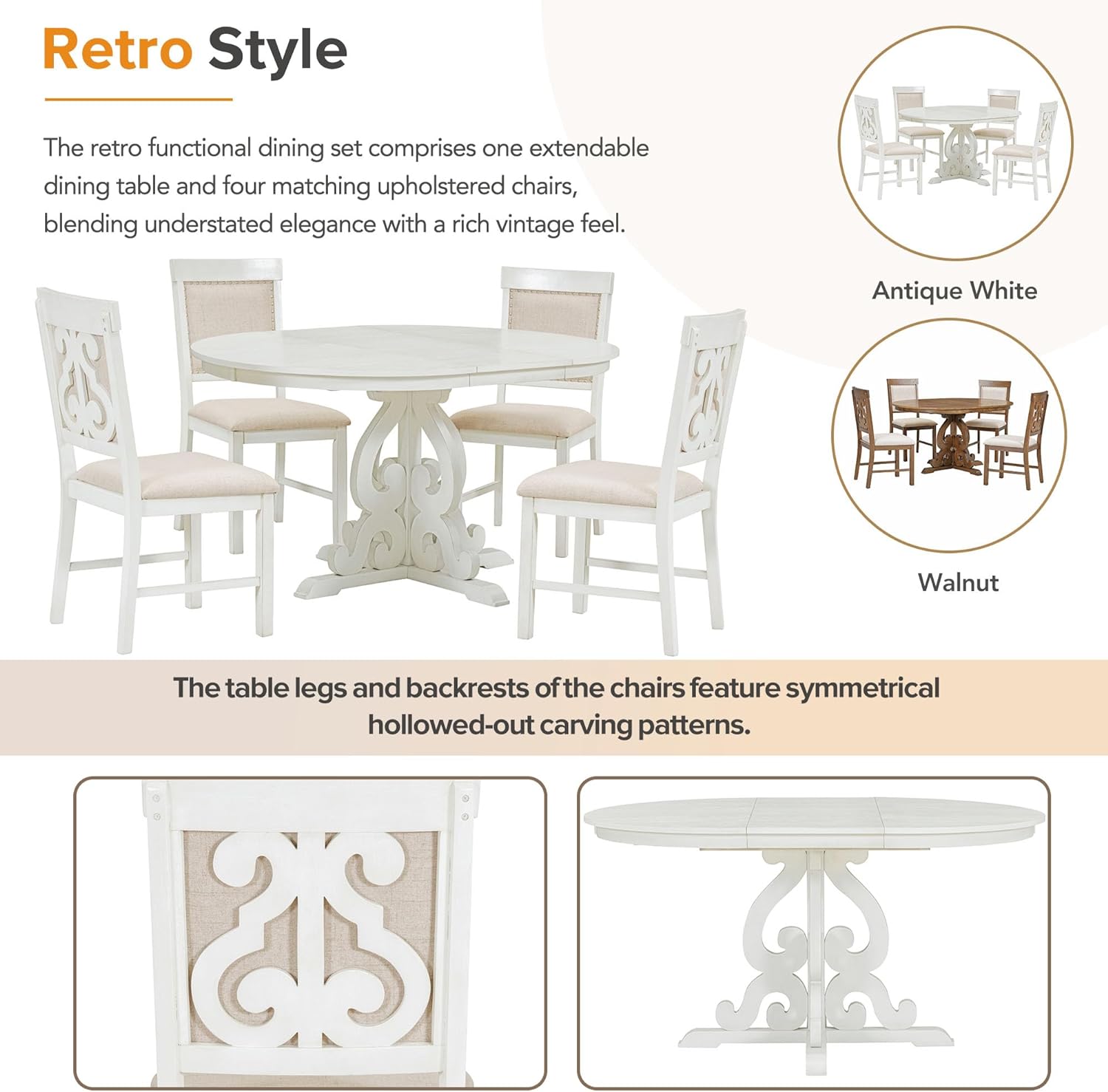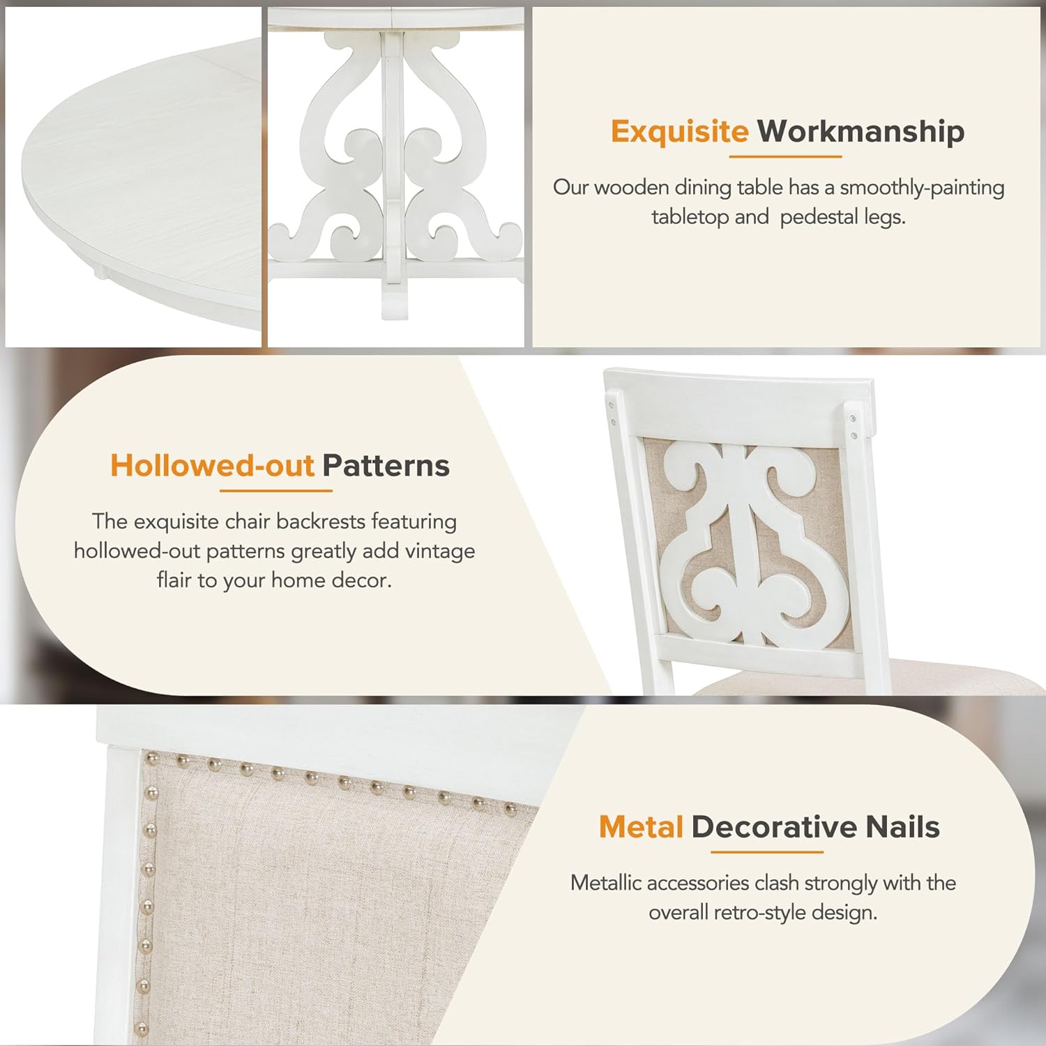 [Round Dining Table Set for 4] The retro feature dining table includes an expandable dining table and four matching upholstered chairs that mix understated elegance with a rich retro feel. The legs and backrest of the tables and chairs are made of symmetrical hollow carving patterns. It is available in two colors, antique white and walnut. No matter which color of cutlery you choose, it will be the finishing touch of your dining room, kitchen or dining room.
