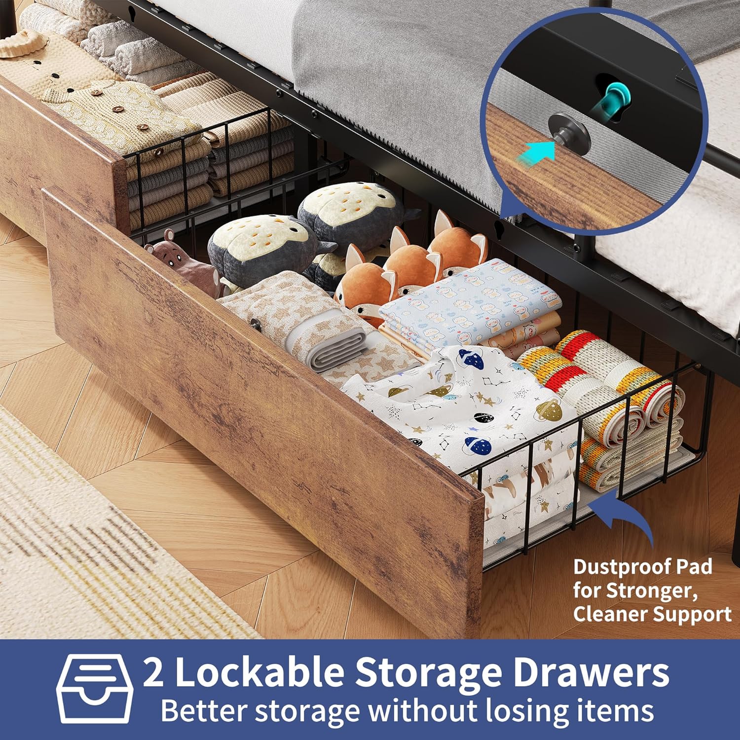 MULTI-FUNCTIONAL STORAGE SOLUTIONS: This twin over twin bunk bed include a handy bedside storage bag for essentials like phones, books, glasses, chargers and remotes, as well as four hooks for hanging bags, scarves, hats and keys, making the top bunk even more practical. This twin size bed frame maximizes space with two large, silent-glide drawer for easy storage. The locking design keeps drawers securely in place, while the bottom dust mats offer cleaner and stronger support