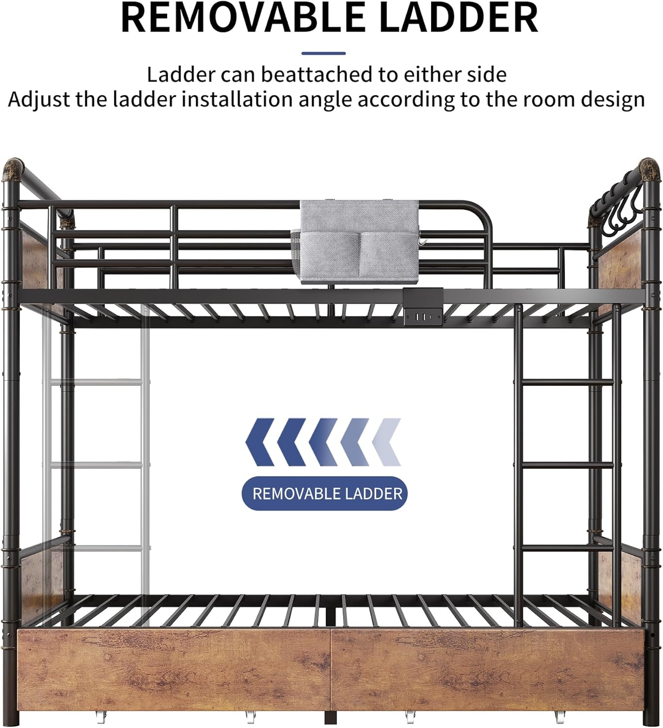MOVABLE CHARGING STATION: This bunk bed twin size comes with a movable charging station that makes life on the top bunk easy and convenient. Featuring 2 USB ports, 1 Type-C port and an 8-foot long power cord, the station can be installed anywhere on the upper bed. Ideal for charging phones, iPads or other devices, it keeps power within reach and adds extra functionality