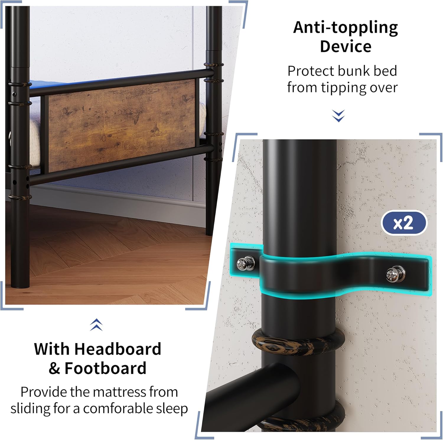 SAFE AND RELIABLE STRUCTURE: Safety is a priority with this heavy duty bunk bed. The top bunk features 16.5-inch high full-length guardrails, offering maximum protection against accidental falls, making it suitable for kids, teens, adults or anyone who moves while sleeping. Additionally, the bunk beds includes an anti-tip kit to ensure stability, providing a secure, wobble-free and noise-free sleep environment