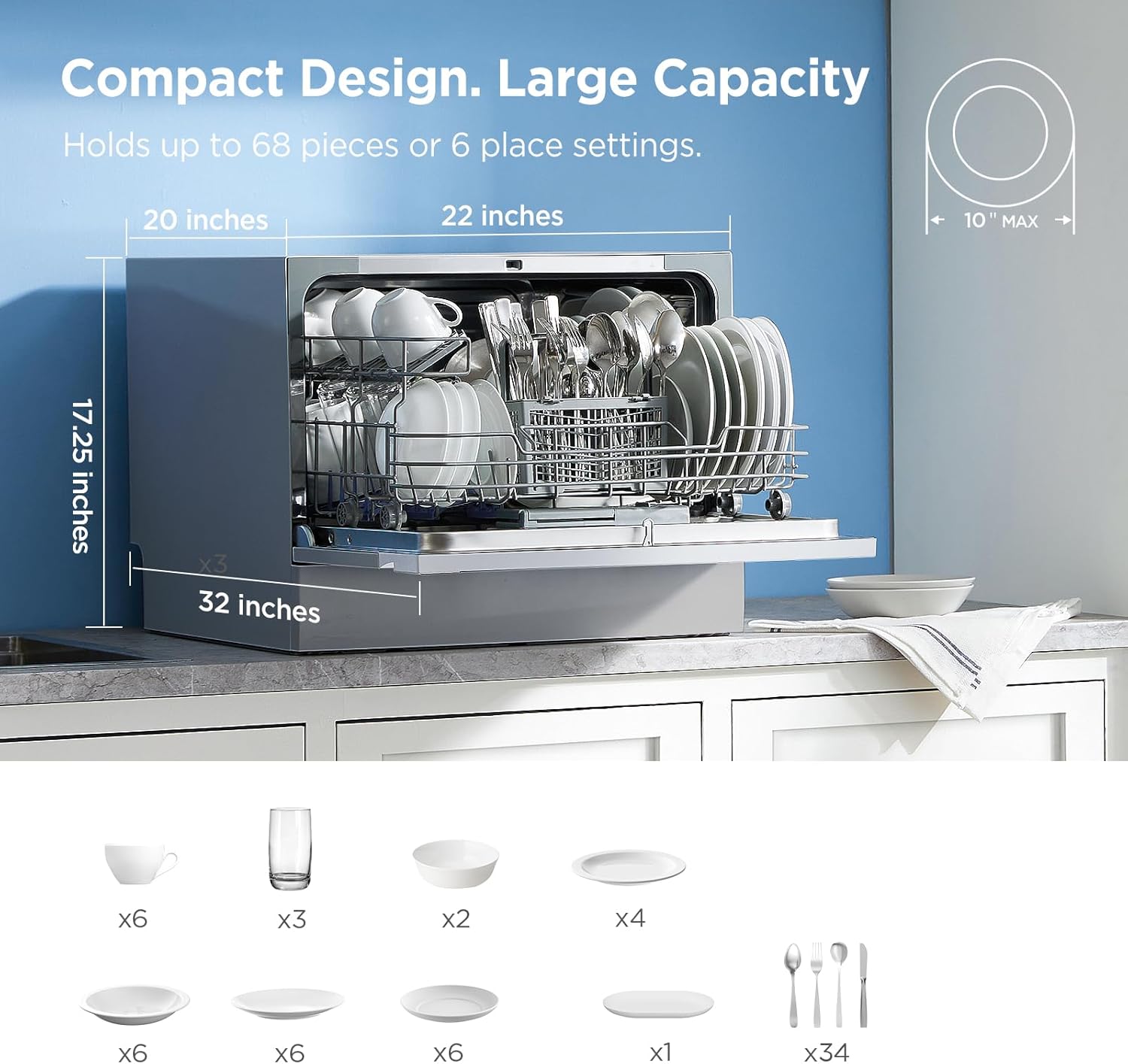 A perfect size (H17.25″×W22″×D20″)- Holds up to 6 Place Settings perfect for 2-3 people. The Midea compact dishwasher is suitable for dorms, RVs, and apartments. This countertop dishwasher can fit up to 70 pieces of tableware and plates up to 10 inches in diameter.
