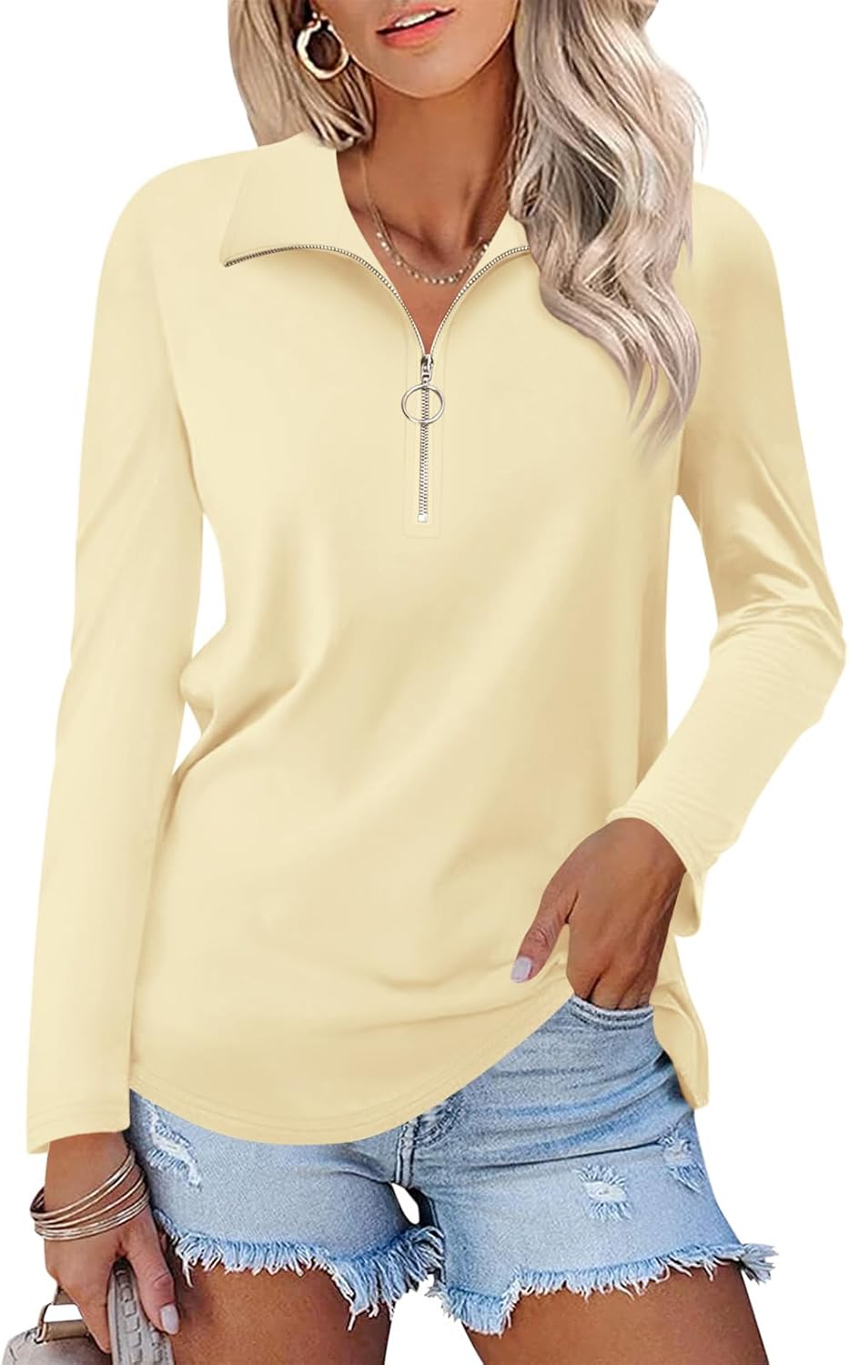 >Fabric:60% Polyester, 35% Cotton and 5% Spandex; Soft, lightweight and good elastic stretchy fabric, easy to dress up and down.>Features: Long Sleeve Shirts, Quarter Zip Pullover, Collared Shirts, Workout Tops, Solid Basic Tees, Casual, Cute and Classic.