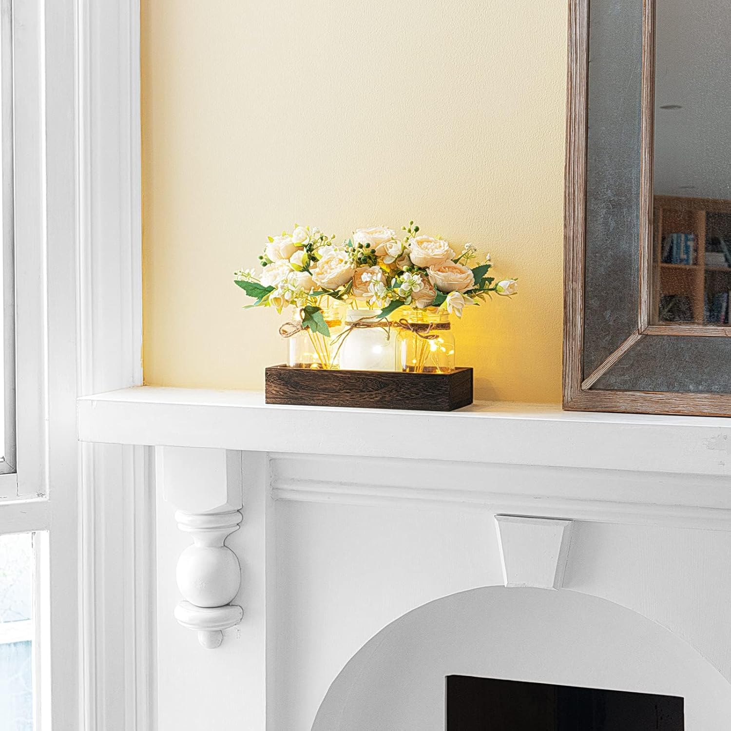Package Included: our product package includes: 1 x wood tray , 3 x mason jars, 3 x artificial flower, light string