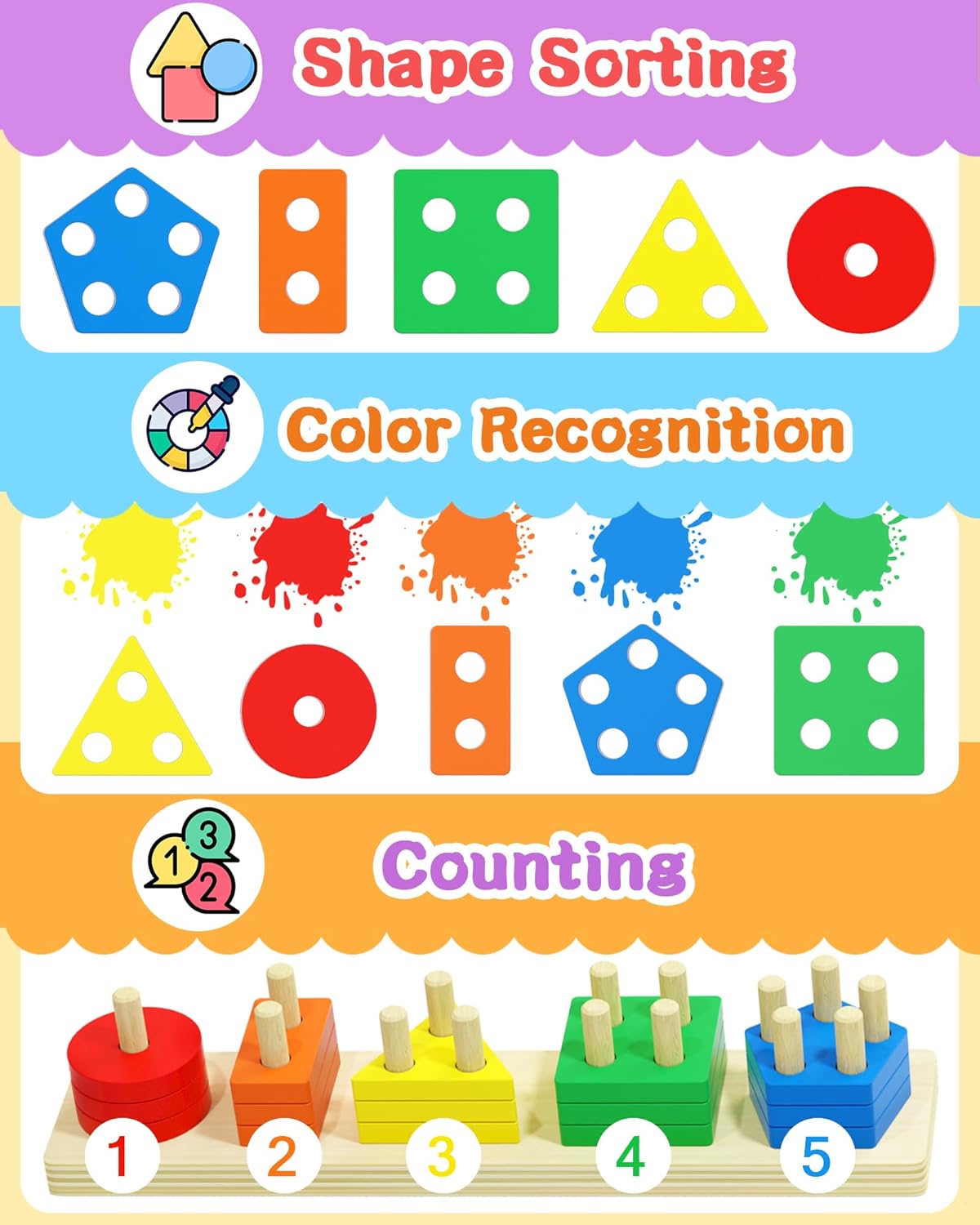 Safe and high-quality toddler toys : We insist on using high quality wood raw materials to provide safe and fun toys for toddlers. The toddler learning toys with a moderate geometric size and smooth edges, can be grasped well by babies while protecting the baby’s delicate skin. We also use the water-based paint, the color more vivid, non-toxic, odorless and anti-fade, for your baby safe and happy childhood.