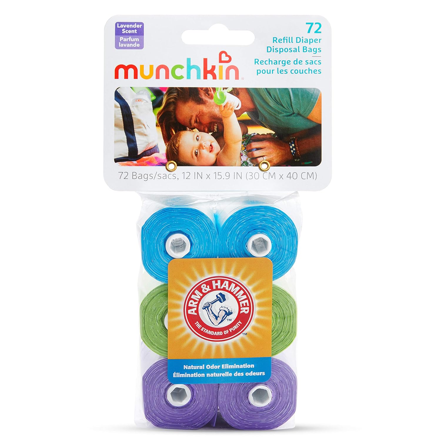 Arm and Hammer bag refills make diaper disposal easy wherever you are. Compatible with the munchkin Arm and Hammer diaper bag dispensers, these convenient refills are great for use at home or on the go. Each bag is infused with Arm and Hammer baking soda for safe, effective and natural odor elimination. Additionally, bags are lightly scented with lavender. Bags are large, durable and easy to separate.