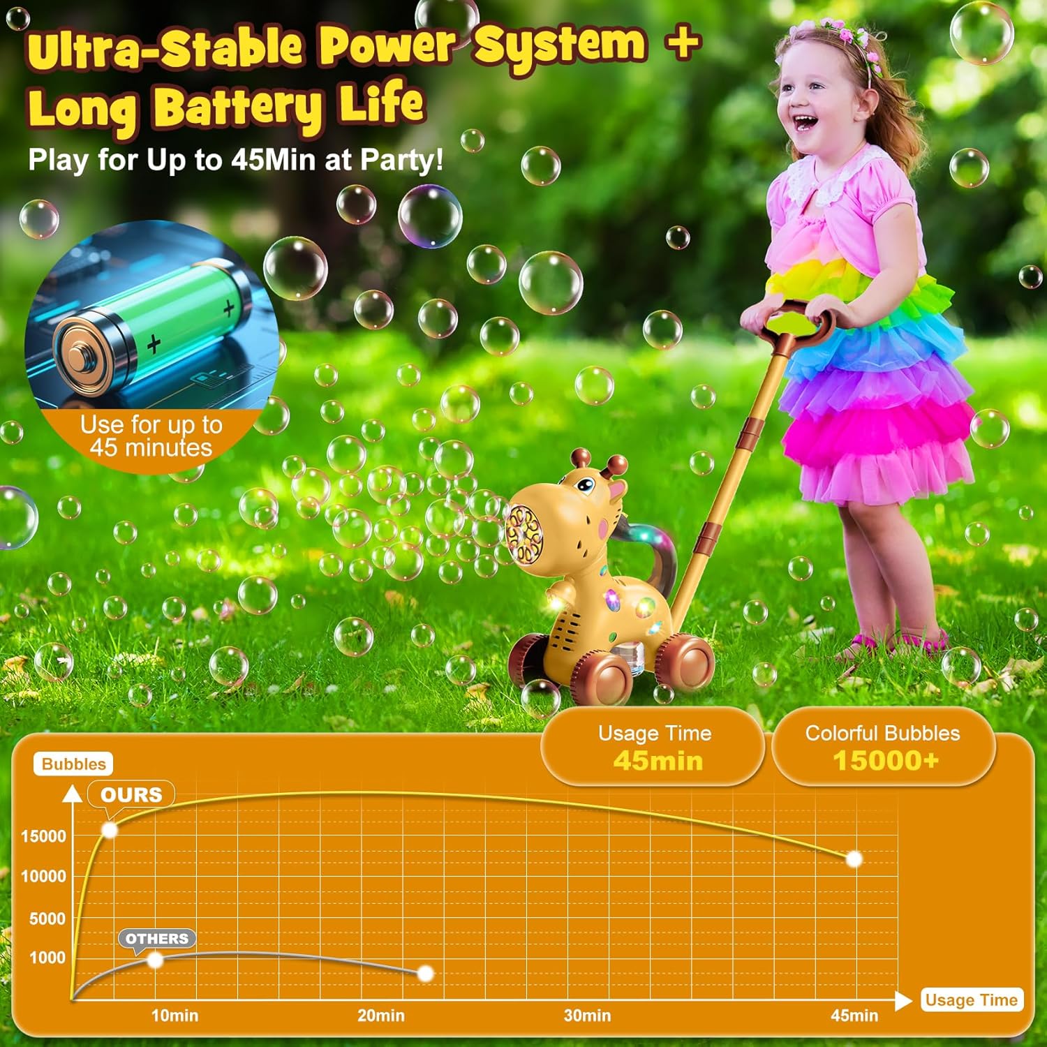 Dual Play Modes & Giraffe Design: This giraffe bubble machine offers two fun options: ① push it with the handle for automatic bubble blowing while walking ② or use it as a handheld bubble machine for more flexible fun. Suitable for indoor play with pets or outdoor toys activities at the park, beach, or backyard. Perfect toddler toys age 1-2.