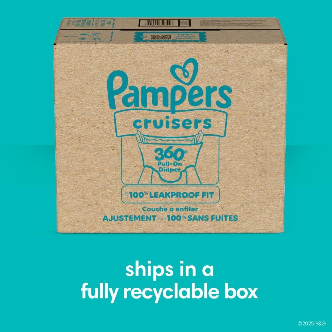 Pampers Cruisers 360 pull-on baby diapers provide our best fit and protection for your active baby at any stage. Unlike ordinary disposable diapers that gap in the back, Pampers Cruisers 360 diapers stretch comfortably around your baby’s waist and adapt to their every move for a flexible, Babyproof and gap-free fit that is up to 100% leakproof. Plus, they feature our Dual Leak-Guard Barriers that gently seal around your baby’s legs, where leaks happen most. And forget fiddling with ordinary diaper tapes! Pampers Cruisers 360 has a 360-degree stretchy waistband designed to quickly and easily pull up onto your wiggly baby. Easy for you to pull on and take off but difficult to remove for your baby. And when a diaper change is complete, we’ve made disposal simple. All you need to do is RIP the Easy-Tear Side, ROLL up the diaper, then secure it with the disposal tape that comes attached to the back. Simple as that. Also, to keep your baby’s delicate skin healthy, Pampers Cruisers 360 delivers breathable dryness, pulling out wetness and locking it away from skin using our exclusive LockAway Channels. Plus, Cruisers 360 is hypoallergenic and completely free of elemental chlorine bleaching, parabens and latex.** * For trusted protection, trust Pampers to help keep your little one happy and comfy on-the-go, the #1 pediatrician recommended brand. **No Natural rubber