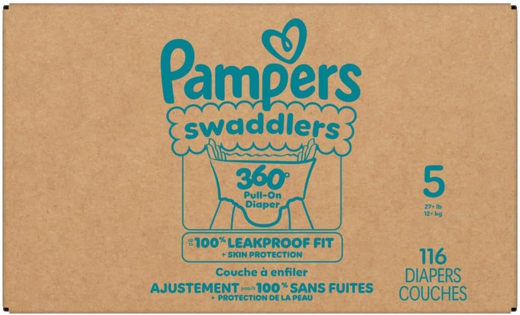 The Pampers Swaddlers 360° comfy, dry protection you know and love just got updated—with E-Z Off tabs for even easier changes. Featuring ultrasoft absorbent layers and Dual-Leak Guard Barriers that help protect where leaks happen most, these diapers provide up to 100% leakproof skin protection for your little one! From the #1 Pediatrician Recommended Brand*, Pampers Swaddlers 360° are designed to support your toddler’s movement from crawling age to standing age with a 360-degree stretchy waistband. The new EZ-off tabs make changes stress-free and mess-free—whether your little one is lying down or standing up—just tab off, wrap up, and pull on a fresh diaper pant. Swaddlers 360° toddler diapers offer trusted protection you can count on: they’re hypoallergenic, dermatologically tested, and free of parabens and latex. Plus, Dual LeakGuard Barriers and a blowout barrier help prevent up to 100% of leaks—even blowouts! To find your baby’s ideal Comfy Dry Fit, just measure by weight and reference our available baby diaper sizes: • Size 3 diapers (16–28 lbs.) • Size 4 diapers (22–37 lbs.) • Size 5 diapers (27+ lbs.) • Size 6 diapers (35+ lbs.) • Size 7 diapers (41+ lbs.) Pair Pampers Swaddlers 360° with Pampers Sensitive Baby Wipes to help make changes quick, easy, and gentle on your baby’s skin. *Based on 2021 survey of U.S. and Canadian pediatriciansSwaddlers 360° pull on diapers offer our best skin protection for your baby! The waistband stretches comfortably around your baby’s waist and adapts to their every move for a soft and comfy fit — no tape needed.