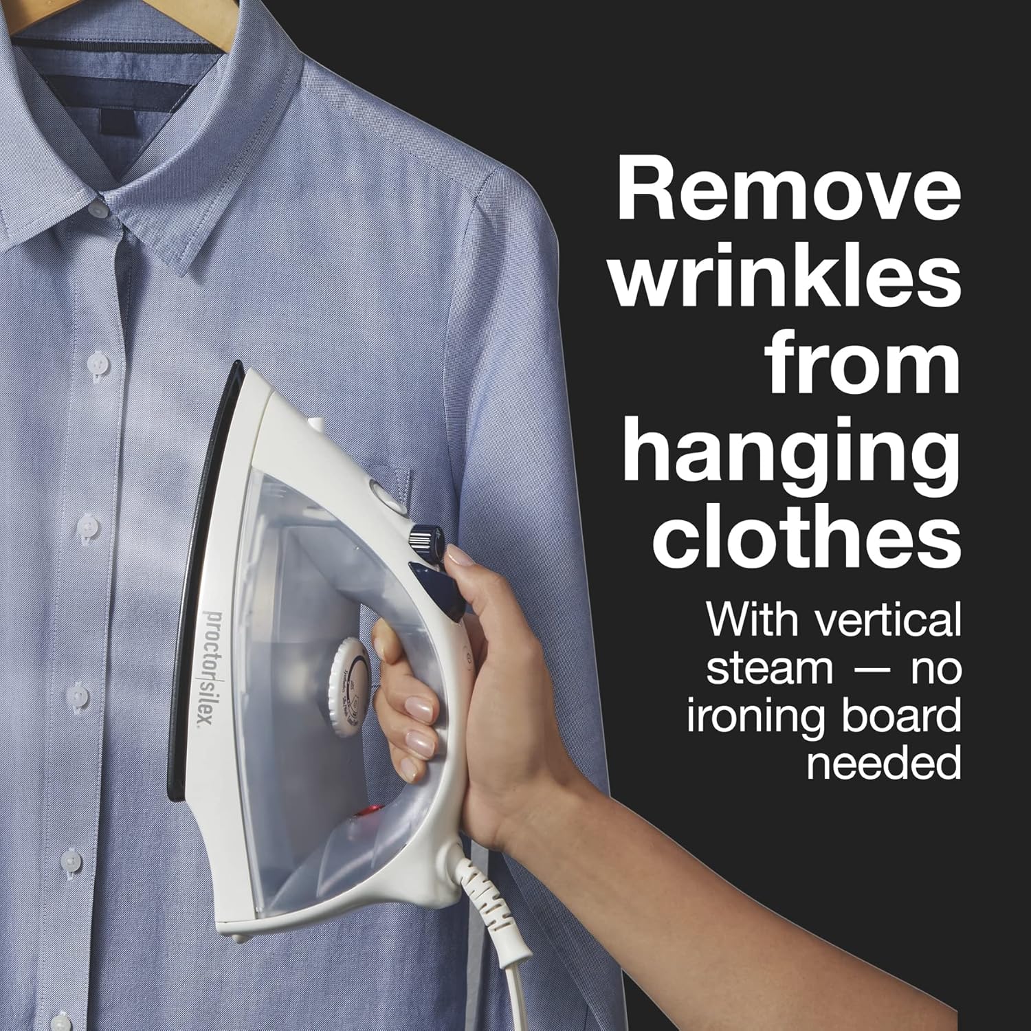 QUICKLY REMOVE WRINKLES FROM HANGING CLOTHES: This steam iron doubles as a garment steamer for clothes. Freshen clothes and loosens wrinkles right on the hanger with the vertical steam function — no ironing board needed.