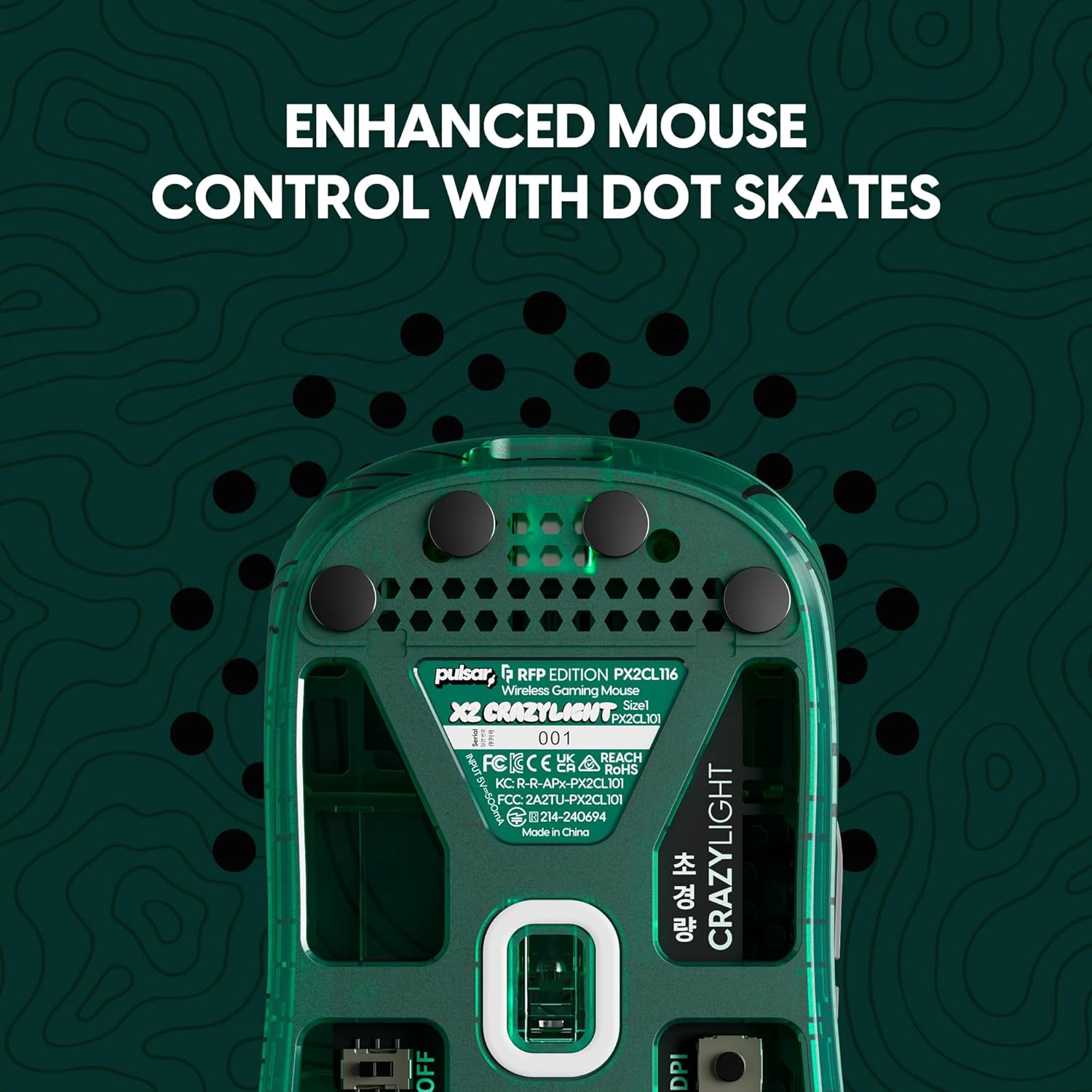 Enhanced Mouse Control with DOT Skates – Equipped with the included Pulsar Dot Skates (16 UHMW-PE pieces, 6.6mm), these skates deliver exceptional low friction for smooth gliding, enhancing both speed and precision on any surface. Built for durability, they resist wear, ensuring consistent performance even with extended use. Ideal for glass and hard mousepads, they are crafted to meet the demands of the most discerning users.