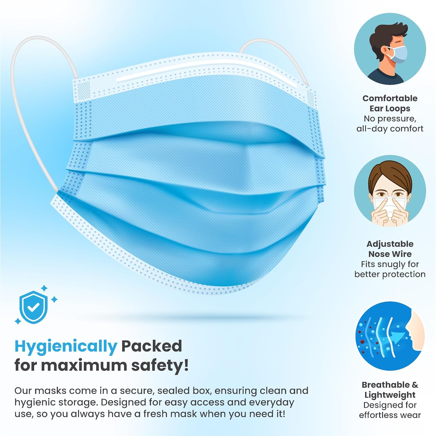 PURE GEM [Pack of 150] Single Use Disposable Blue Face Mask, Soft on Skin, 3-ply Masks Facial Cover with Elastic Earloops Great For Home, Office, School, and Outdoors