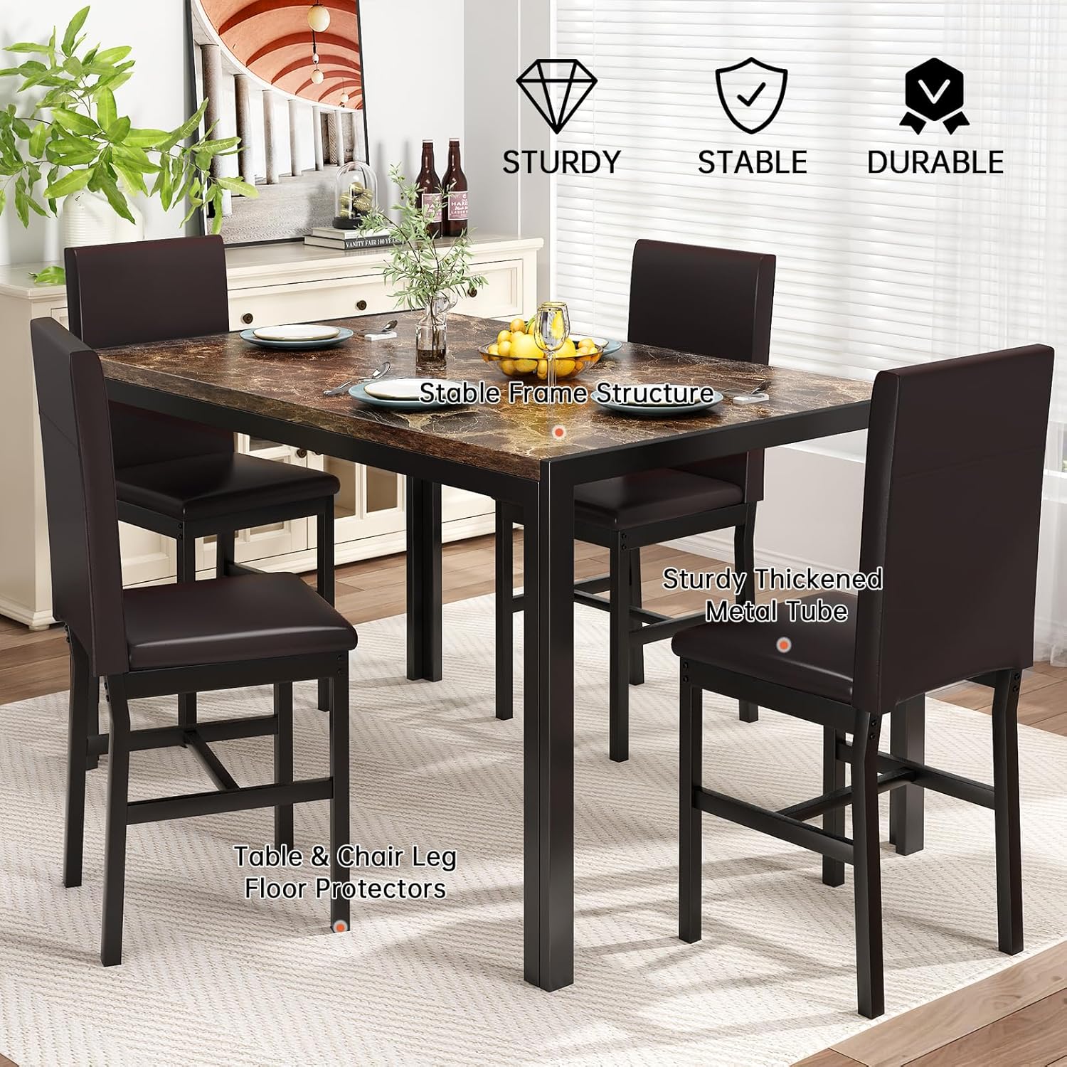 Dining Room Table Design: high quality MDF material is used, and the surface is covered with elegant Faux marbles. The touch is smooth and delicate, so as to bring you extraordinary dining enjoyment without considering too much cleaning and maintenance.Dining Room Chair Design: the material is made of resilient cushion and high-quality PU leather fabric. The ergonomic design of high backrest and slightly bent back legs is designed to improve the overall comfort and stability! dining table set for 4dining table set for 4