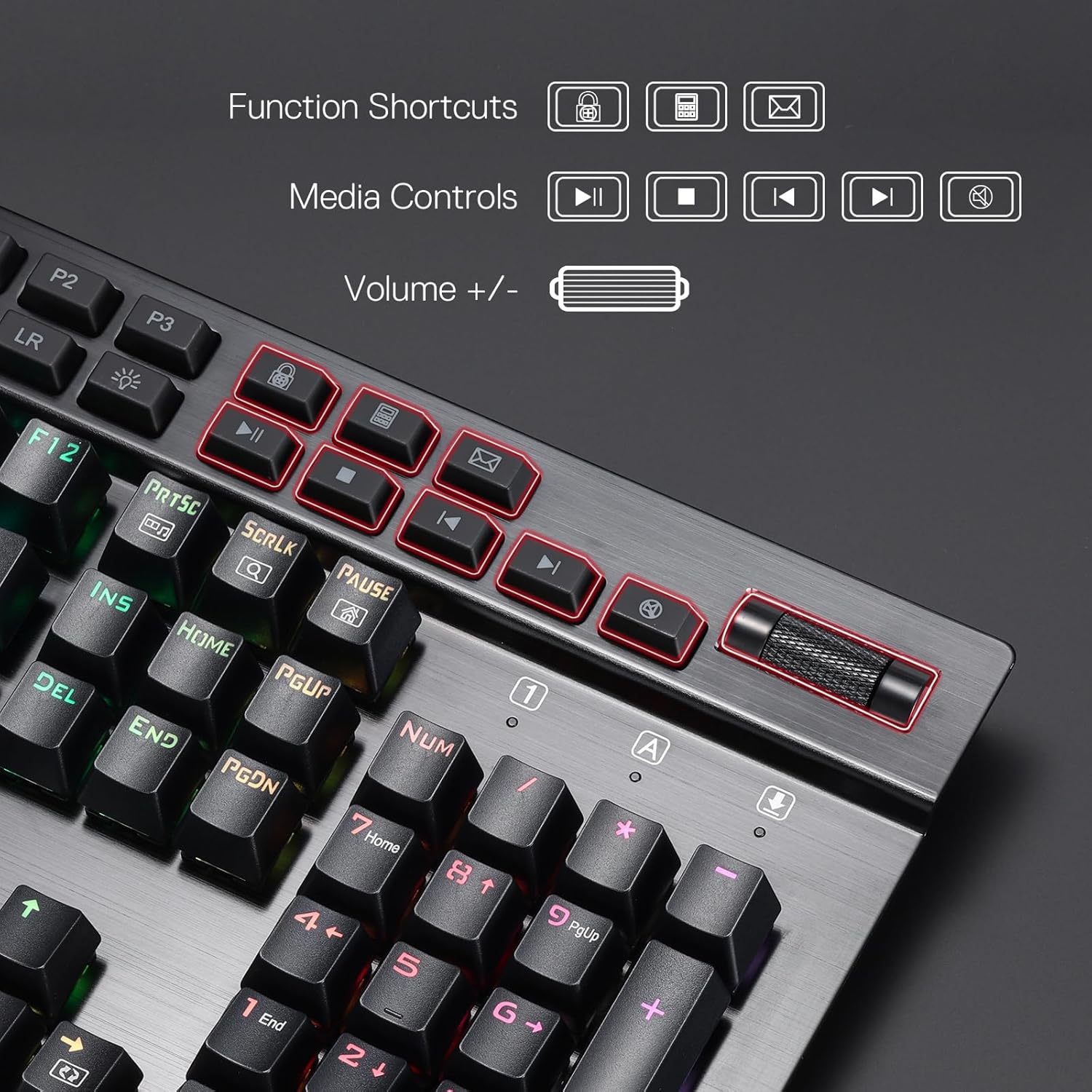 Dedicated Media Controls – The controls let you quickly play, pause, and skip the music right from the keyboard without interrupting your game. The dedicated scroll bar at the top right allows adjustment of system volume.