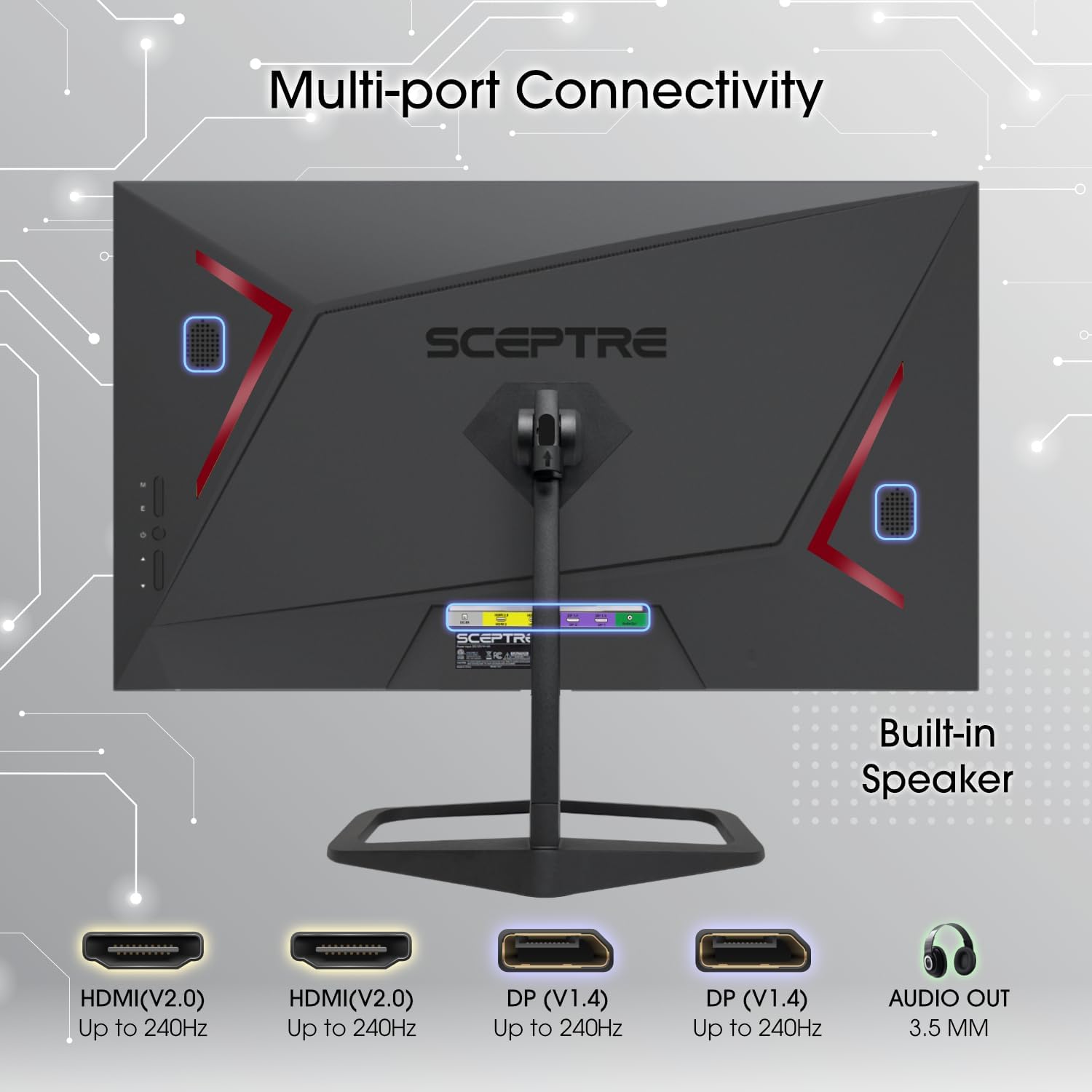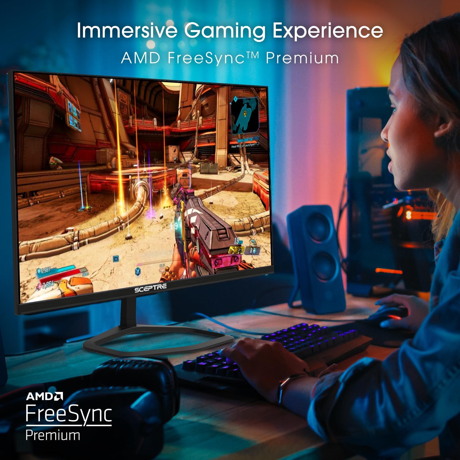 Introducing the Sceptre E255B-FWD240.A1 High Refresh Rate Gaming Monitor – A Monitor with it’s performance unleashed! Elevate your gaming experience to new heights with the Sceptre High Refresh Rate Gaming Monitor. Designed for the modern gamer who demands top-tier performance, this cutting-edge monitor delivers a visual feast that goes beyond ordinary displays. Boasting a 25 inch diagonal viewable 1920×1080 display, witness every detail come to life in stunning high definition. Whether you’re navigating intense battlegrounds or exploring vast virtual landscapes, the vibrant colors and sharp contrasts will keep you at the edge of your seat. Bid farewell to stuttering and tearing. The E255B features a lightning-fast refresh rate of 240Hz and a swift response time of 1ms BR, ensuring buttery-smooth gameplay without a hint of motion blur. Immerse yourself in the action as this monitor keeps pace with the most demanding gaming scenarios. Get lost in the game with the immersive deep colors of a 100% sRGB rated VA panel. It’s not just a monitor; it’s a portal to another dimension. Stay ahead of the competition with our built-in AMD FreeSync Premium technology. Experience tear-free gaming with flawless synchronization between the monitor and your graphics card. The E255B ensures that every frame is delivered with precision, giving you the competitive edge you need. Crafted with a sleek and modern aesthetic, the E255B not only performs like a champion but looks the part too. The slim bezels maximize your viewing area, and versatile connectivity options, including 2 x HDMI, and 2 x DP making it a seamless fit for your gaming setup. Upgrade your gaming rig with the E255B-FWD240.A1 High Refresh Rate Gaming Monitor – where style meets performance, and victory meets pixels. Elevate your gaming experience today!