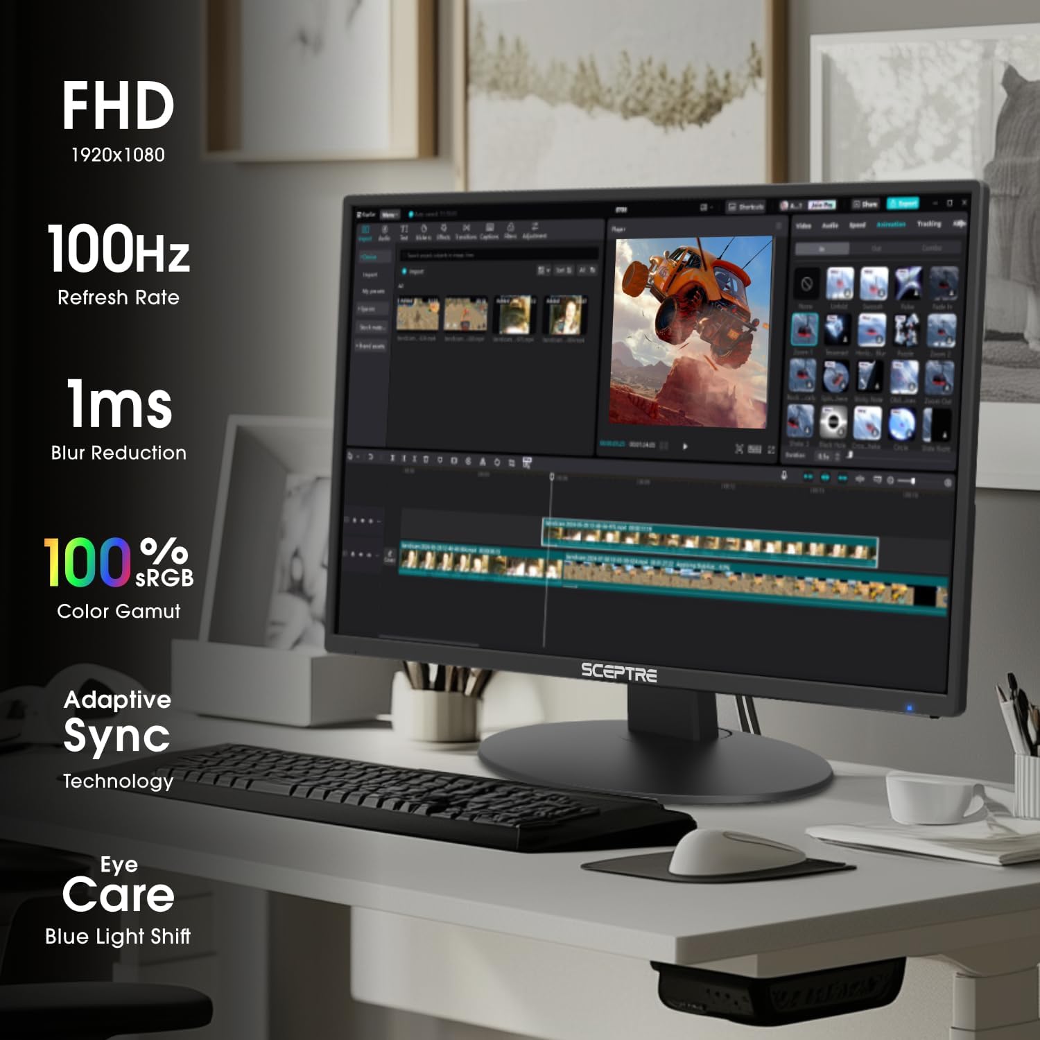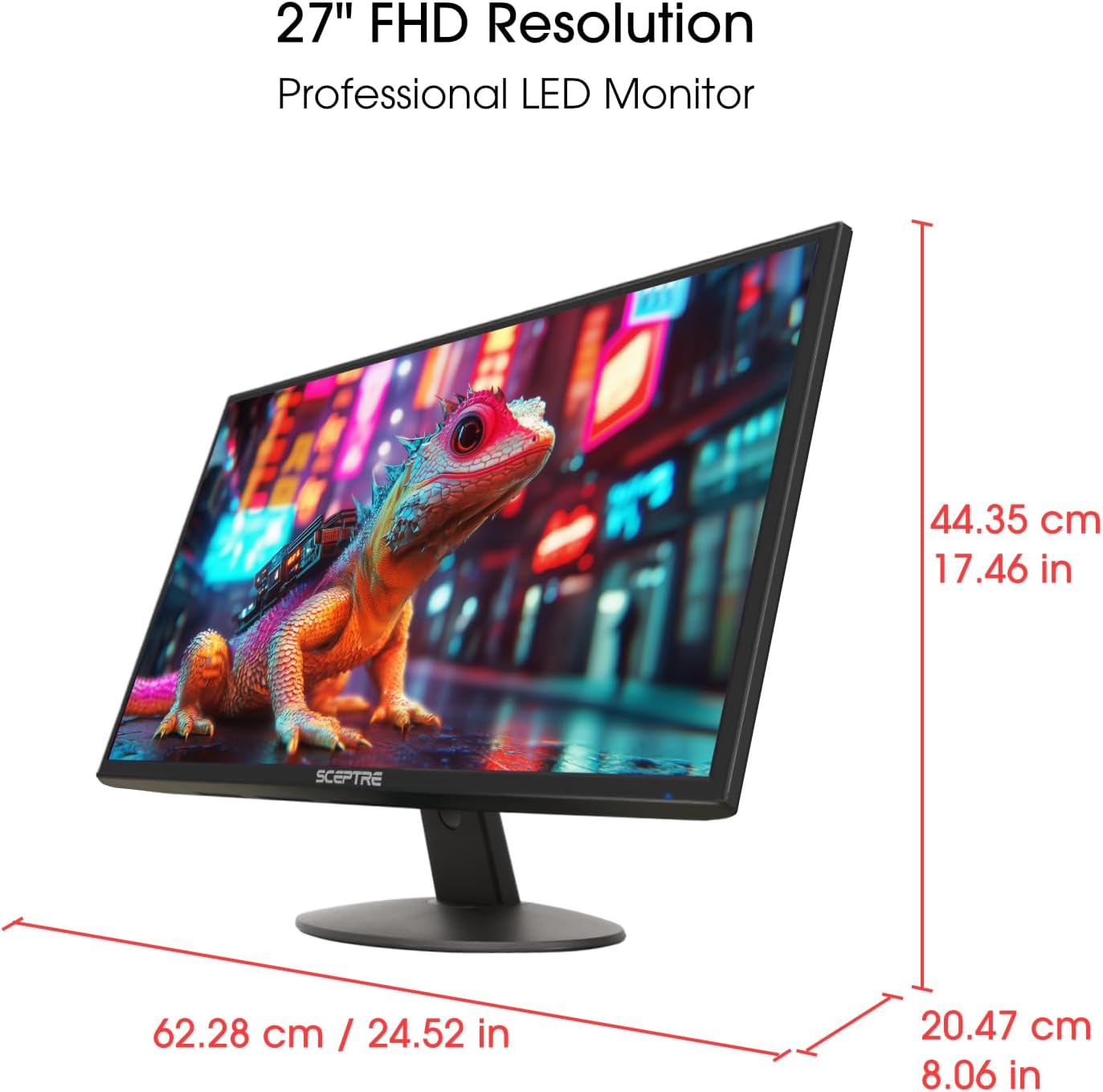 Blur the Lines: Work and Play Seamlessly with the Sceptre Essential Gaming Monitor E275 The lines between work and play are blurring. The Sceptre E275 monitor bridges the gap, offering the perfect blend of features for both productivity and high-octane gaming. Power Through Your Day: Sharp Focus: Tackle spreadsheets and creative projects with stunning 1920×1080 resolution. Every detail is crystal clear, ensuring pixel-perfect precision for all your tasks. Enhanced Workflow: Experience smooth visuals and a responsive feel with a 100Hz refresh rate. Say goodbye to lag and hello to a seamless workflow, whether you’re editing videos or dominating deadlines. Unleash Your Inner Gamer: Immersive Experience: Dive into captivating in-game worlds on a vibrant 27-inch display. Slim bezels maximize your viewing area, pulling you deeper into the action. Smooth Gameplay: Conquer every challenge with fluid, responsive graphics. The 100Hz refresh rate eliminates choppiness and delivers a winning edge in fast-paced games. Console Ready: Connect effortlessly to your PC or gaming console with a variety of ports, including 2 x HDMI. The E275 seamlessly integrates into your existing setup. The Essential Choice: The E275 eliminates unnecessary bells and whistles, focusing on core performance and functionality. Enjoy a sleek, minimalist design that complements both your workspace and gaming station. This monitor is built to last, delivering lasting durability for long hours of use. Sceptre E275: Where Work Ethic Meets Winning Performance.