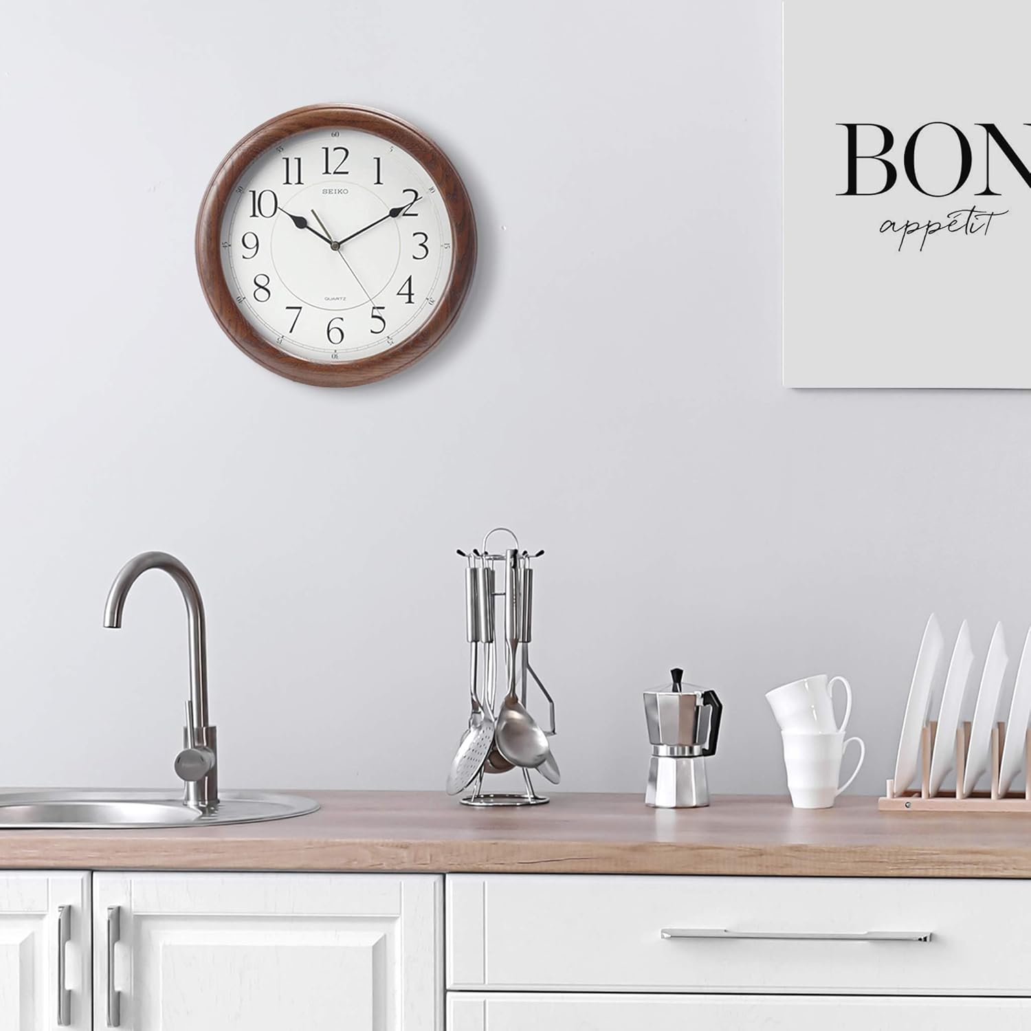 This dark brown solid oak clock with Arabic Numbers and quiet sweep is 13 inches round and brings warmth and sophistication to the home as well as office space. Classically designed, it features a brown case with a wooden grain finish, glass cover, and a quiet sweep second hand. Powered by 1 AA battery (included). Overall dimensions: 13 X 13 X 1.5 inches. All Seiko clocks are equipped with quartz movement making it the most accurate at time keeping.