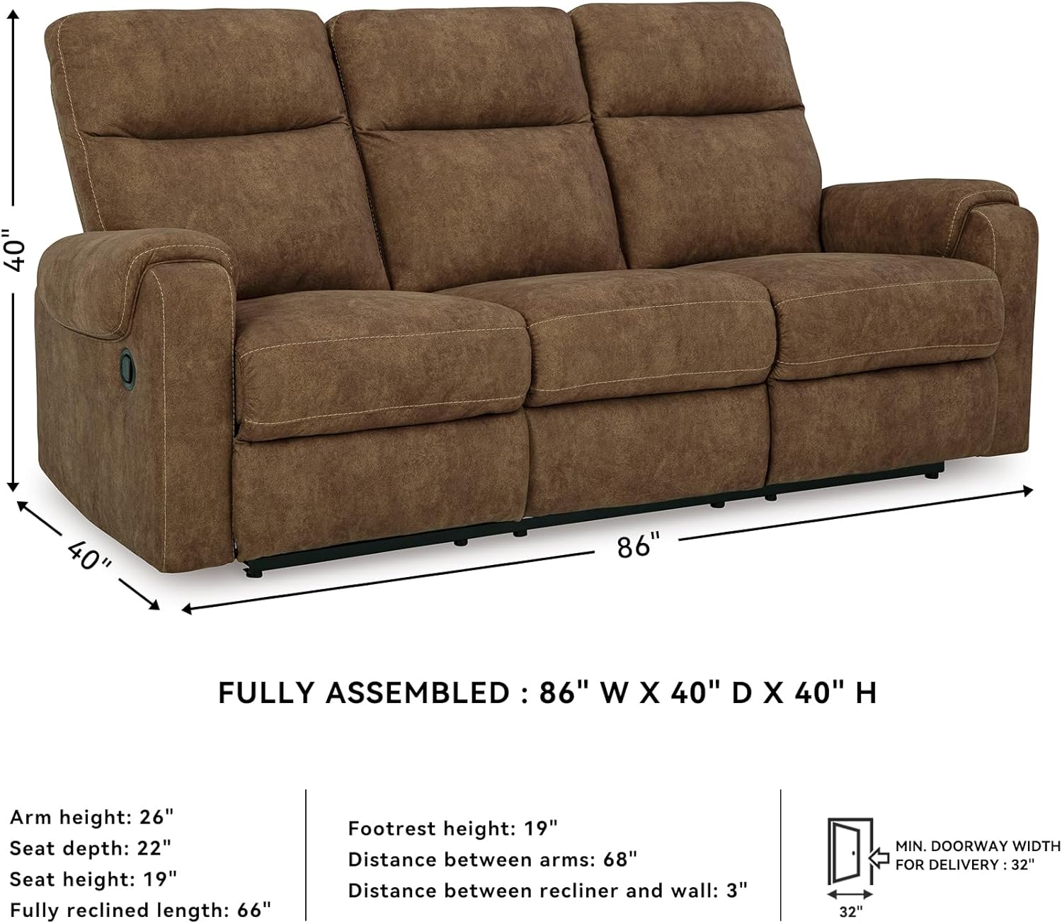 DIMENSIONS: This item measures 86″ W x 40″ D x 40″ H. Fully reclined length: 66″. Distance between recliner and wall should be at least 3″