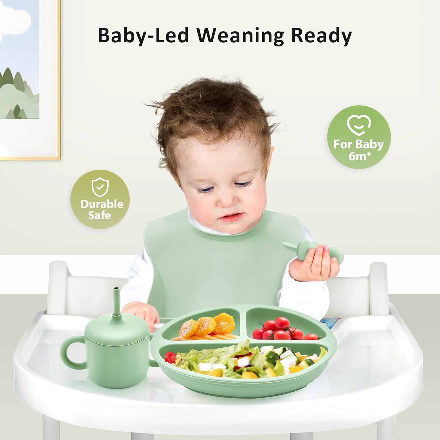 [No More Mealtime Mess – Extra Strong Suction]: Our suction bowls and divided plates feature an upgraded suction base that locks firmly onto smooth highchair trays and tabletops. The sectioned plate helps separate different foods, encouraging independent eating while preventing spills, drops, and messes on the floor.