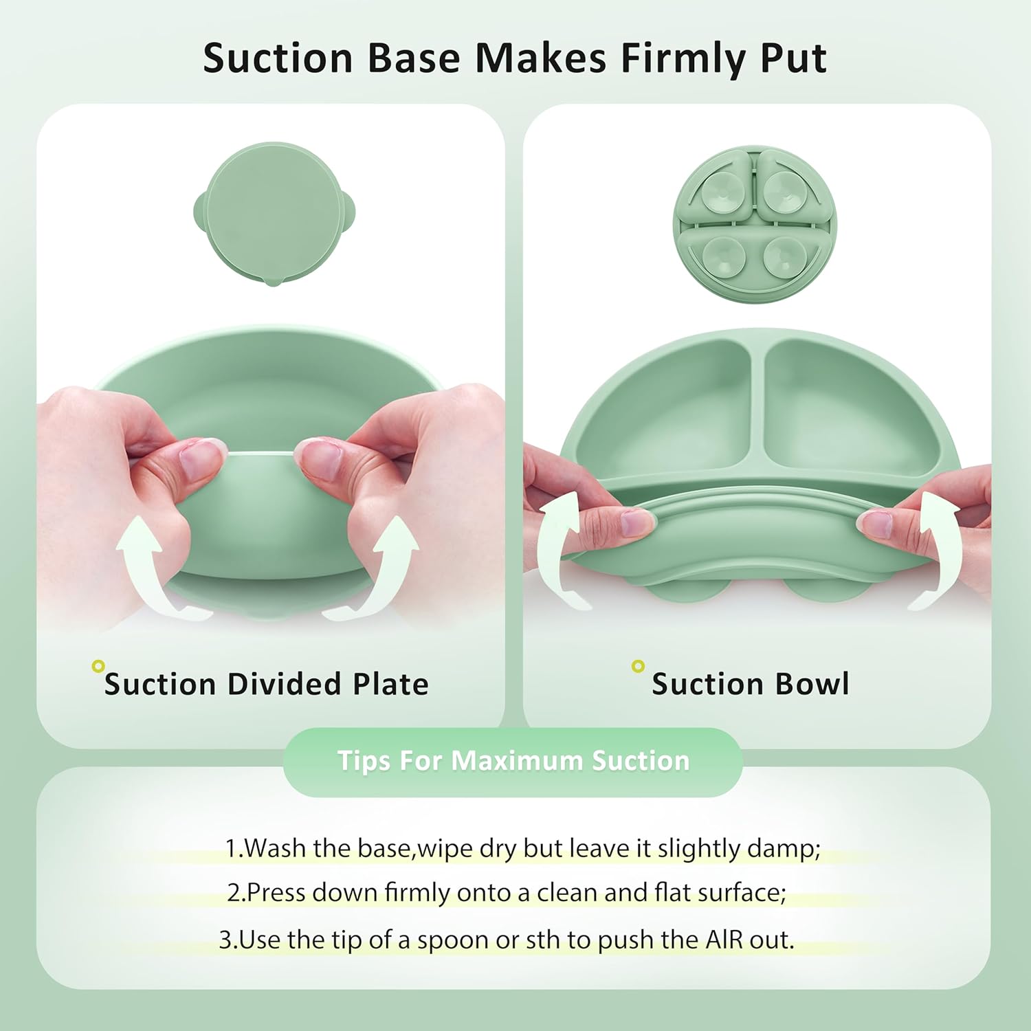 4 suction bases provide strong suction ensuring the plate stays put, which effectively avoid mess caused during the meal time