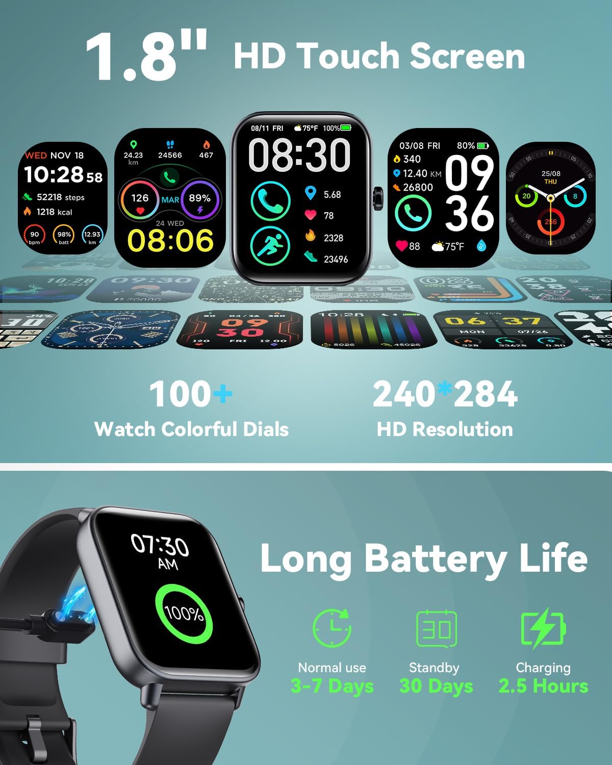 【1.8 Inches Touch Screen & 120+ Dials】The 1.8 inches watch for women(men) has an ultra-high-definition colorful touch screen, With 240 * 284 resolution, you can view messages and data more clearly and easily. There are over 120 different styles of dials for you to choose from, and you can also upload photos of your family, pets, and scenery to customize a dial with your own style.