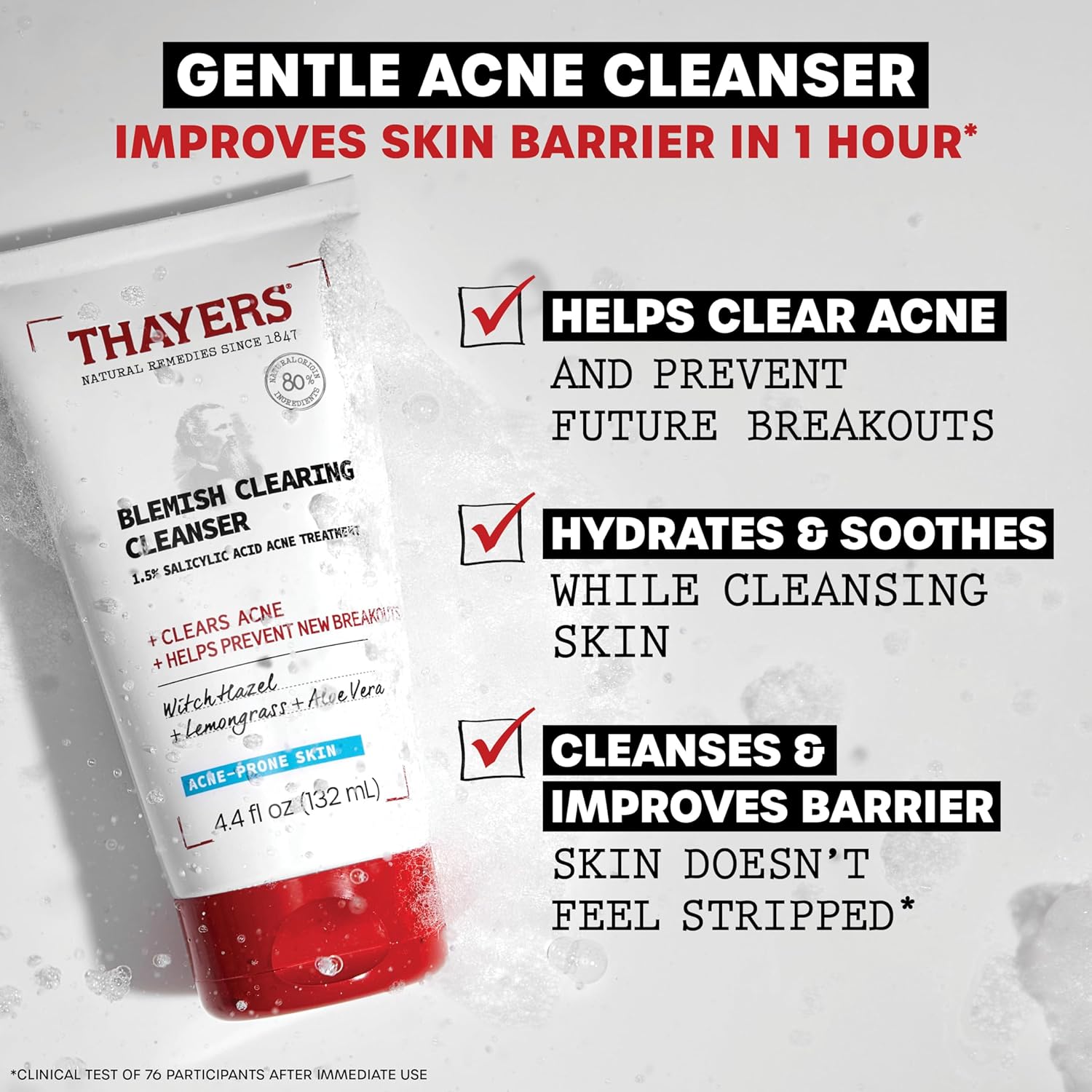 Acne Face Wash with Salicylic Acid:. Wash away blemishes and leave your skin feeling clean, hydrated and soothed! Thayers Alcohol-Free Blemish Acne Cleanser helps clear existing acne blemishes, blackheads, and whiteheads, while actively preventing breakouts