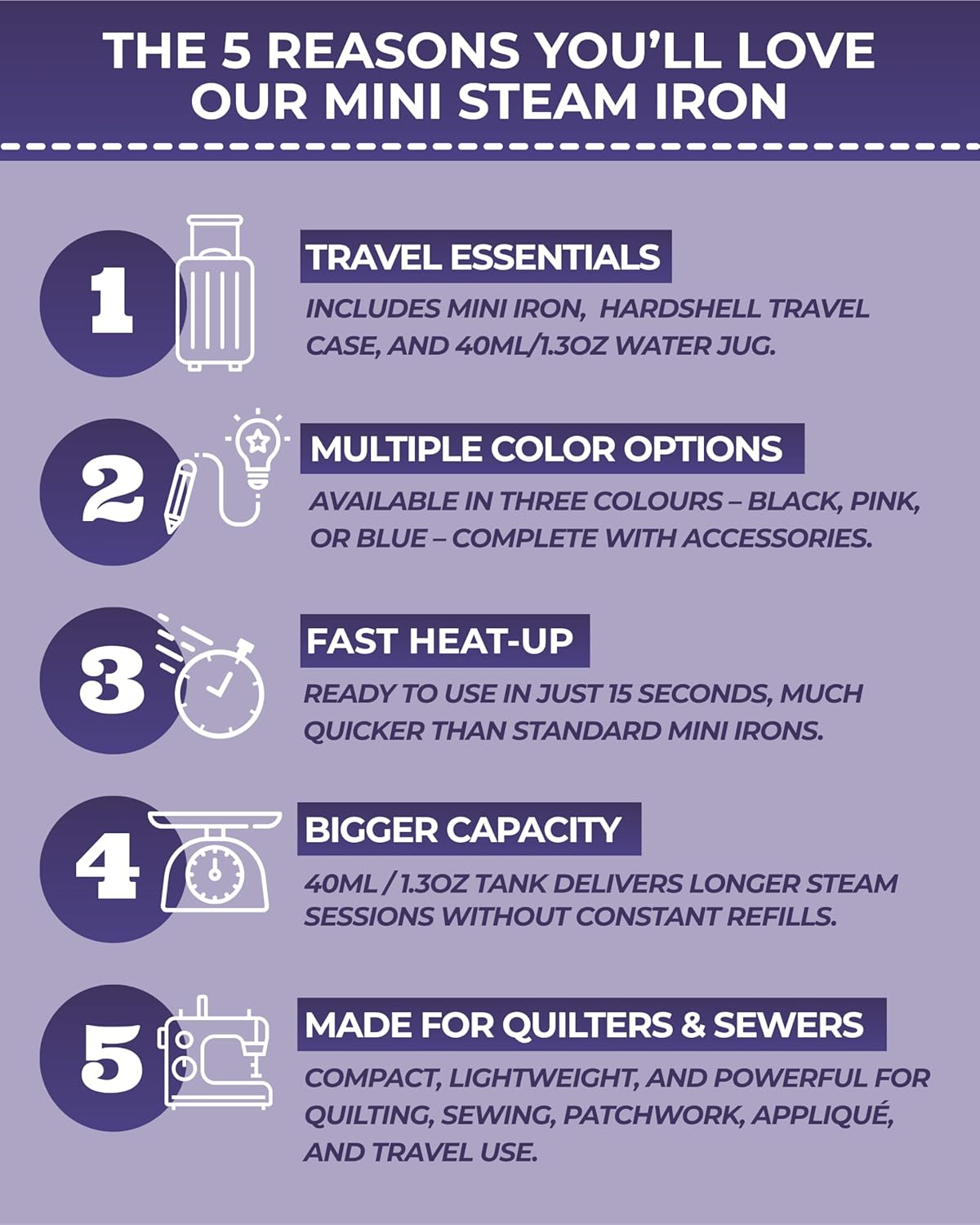 Effortless Precision for Quilters: A portable craft iron designed for comfort and control, this mini quilting iron makes seam-pressing and detail work easier than ever. This portable steam iron excels as a craft travel iron mini.