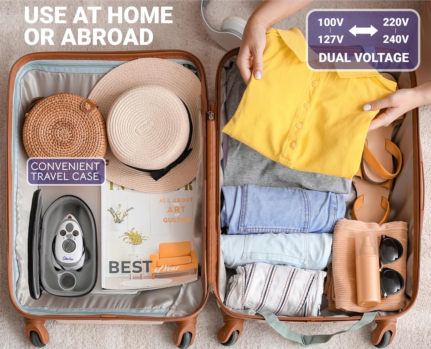 Dual-Purpose Iron for Travel & Crafts: This mini steam iron works as both a portable quilting iron and a clothes iron, Perfect for fabric pressing, applique, and everyday garments. The iron steamer function enhances its versatility, and dual voltage options of 120V/240V allow it to be used worldwide for peace of mind when travelling.