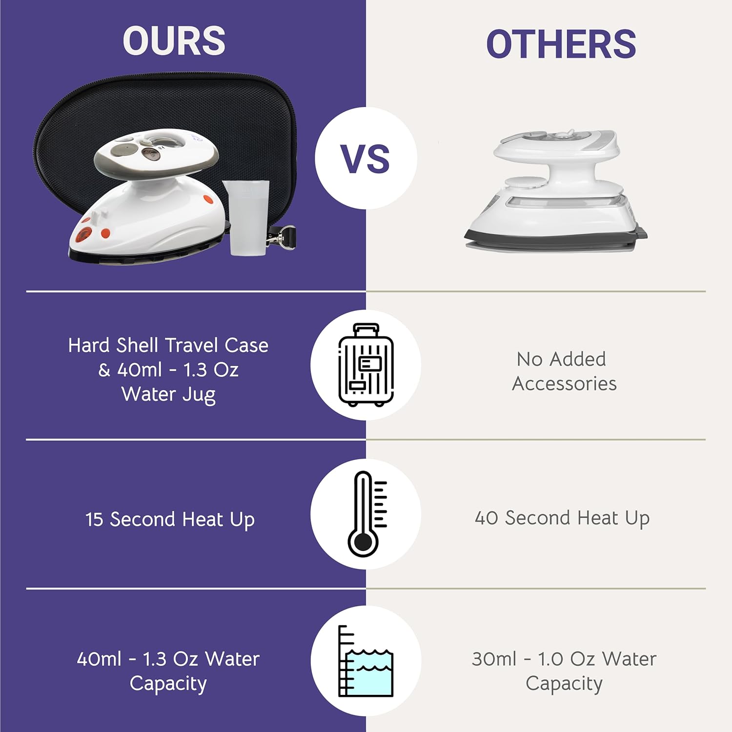 Compact & Portable Mini Iron: Our mini iron offers a convenient and efficient solution for wrinkle-free clothes on the go. Lightweight and easy to pack, this travel iron combines the power of a full-sized clothes iron with the convenience of a small iron