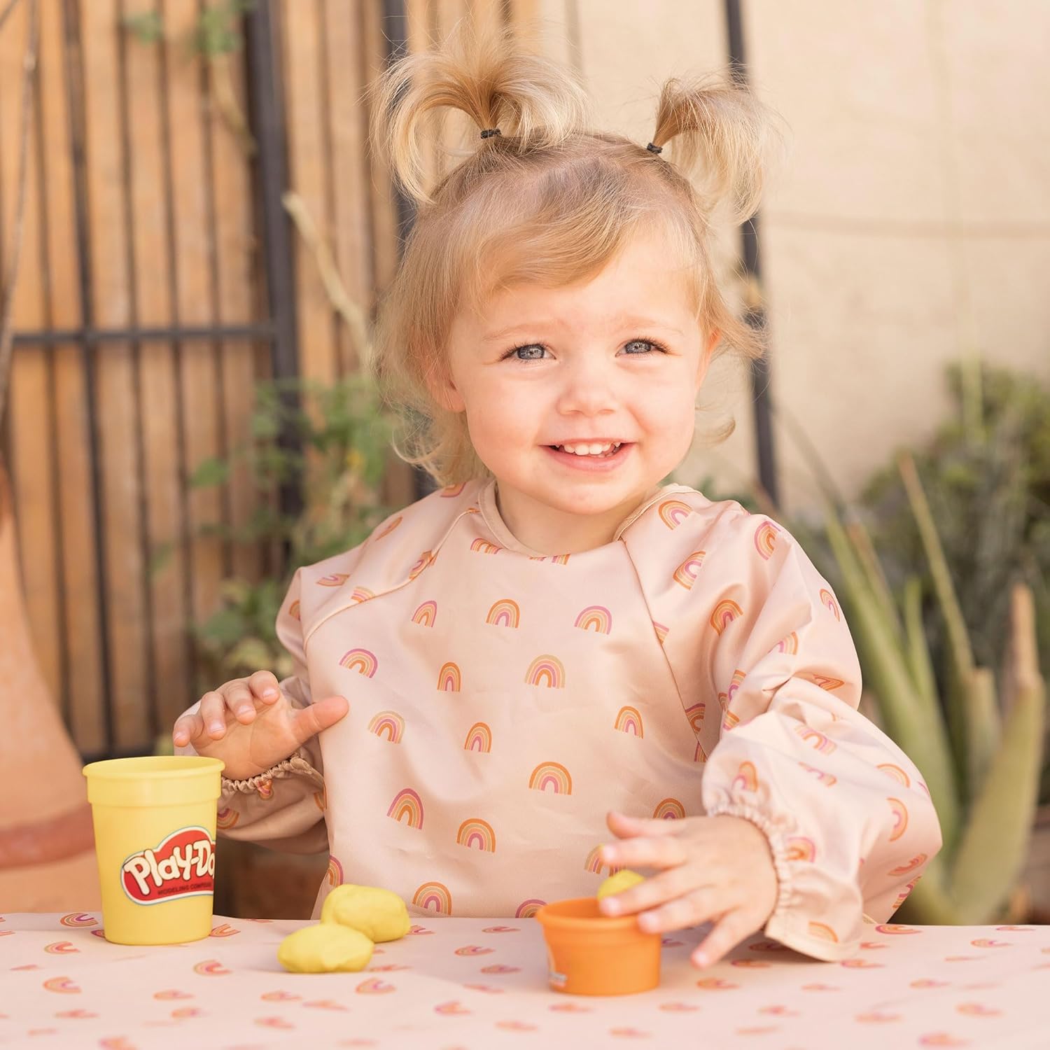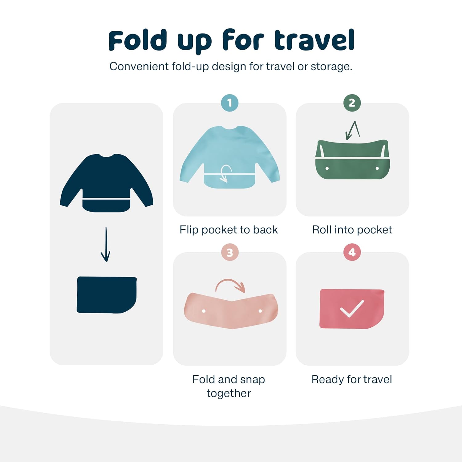 TRAVEL BUDDY:The must-have baby feeding essentials for on-the-go parents! Our long sleeve waterproof smock bib (fits 6-24 months) is a versatile wipeable bibs with scratch-free closures and 360 degrees puree-proof protection.This bib with sleeves is perfect for plane or car meals, It folds flat in diaper bags,handles baby-led weaning messes and makes a great gender-neutral baby shower gift.Ideal for parents needing baby eating essentials on the go.