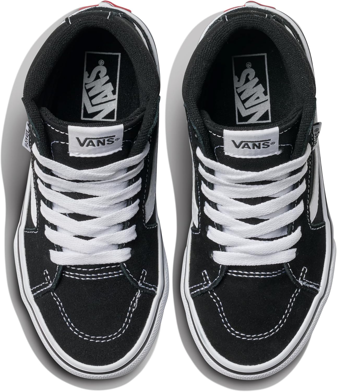 Comfortable, cool, and built to keep up with every adventure, the Vans Youth Filmore Hi shoes are the perfect high-top sneakers for school days, weekends, and everything in between. Made with sturdy canvas and suede uppers, they feature the legendary Vans Sidestripe and a higher collar for a bold, standout style that works with any look. Designed to feel great from the first wear, the lightly padded collar offers a snug, cushioned fit that helps prevent rubbing during long days on their feet. The signature rubber waffle outsole adds grip and flexibility, so kids can move with confidence. Since 1966, Vans has inspired creativity, individuality, and self-expression – because having fun never goes out of style.