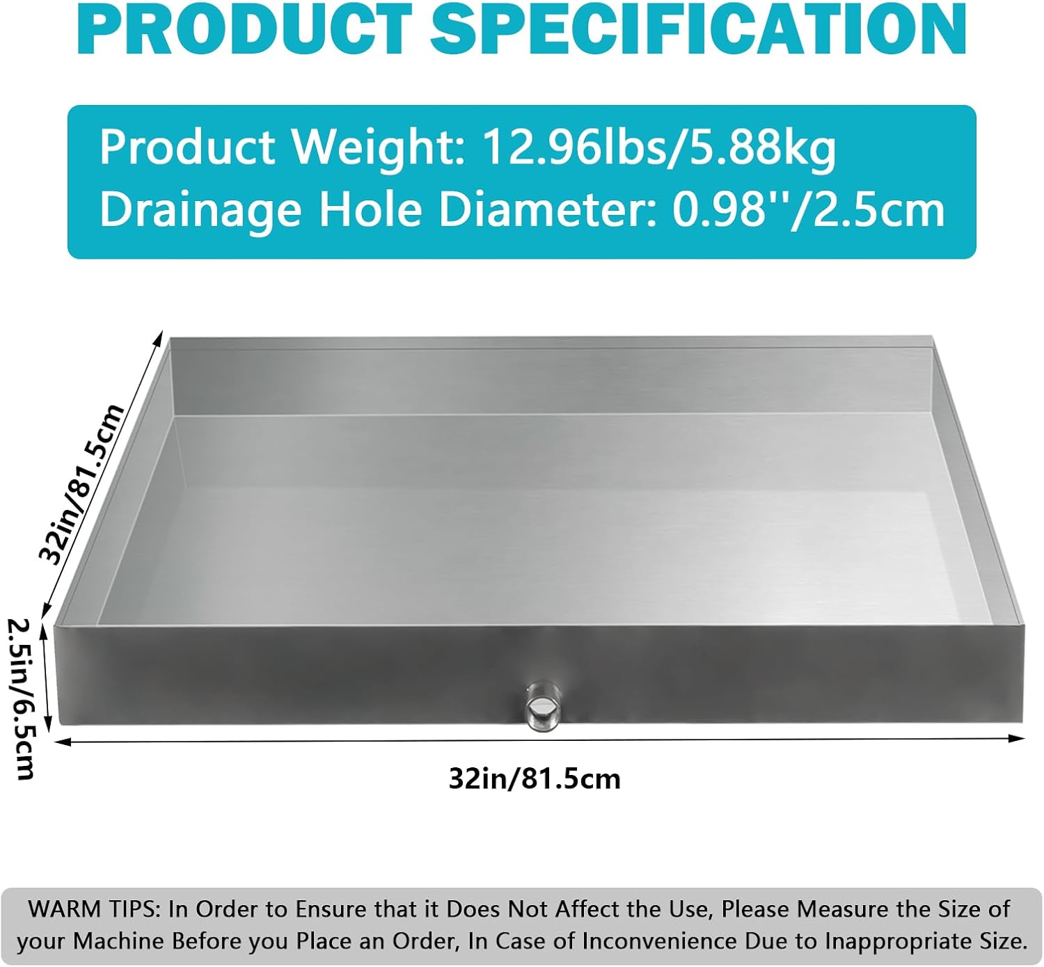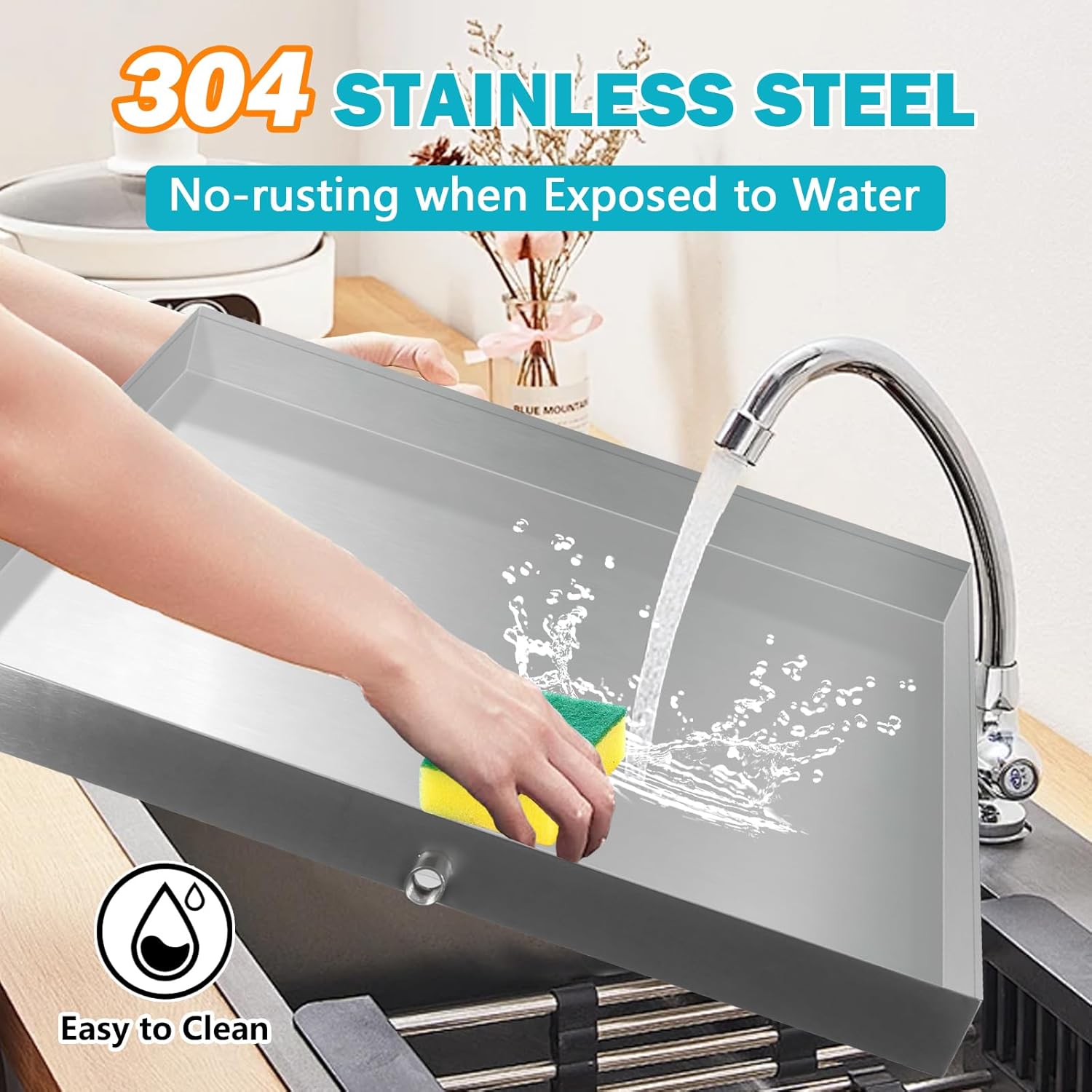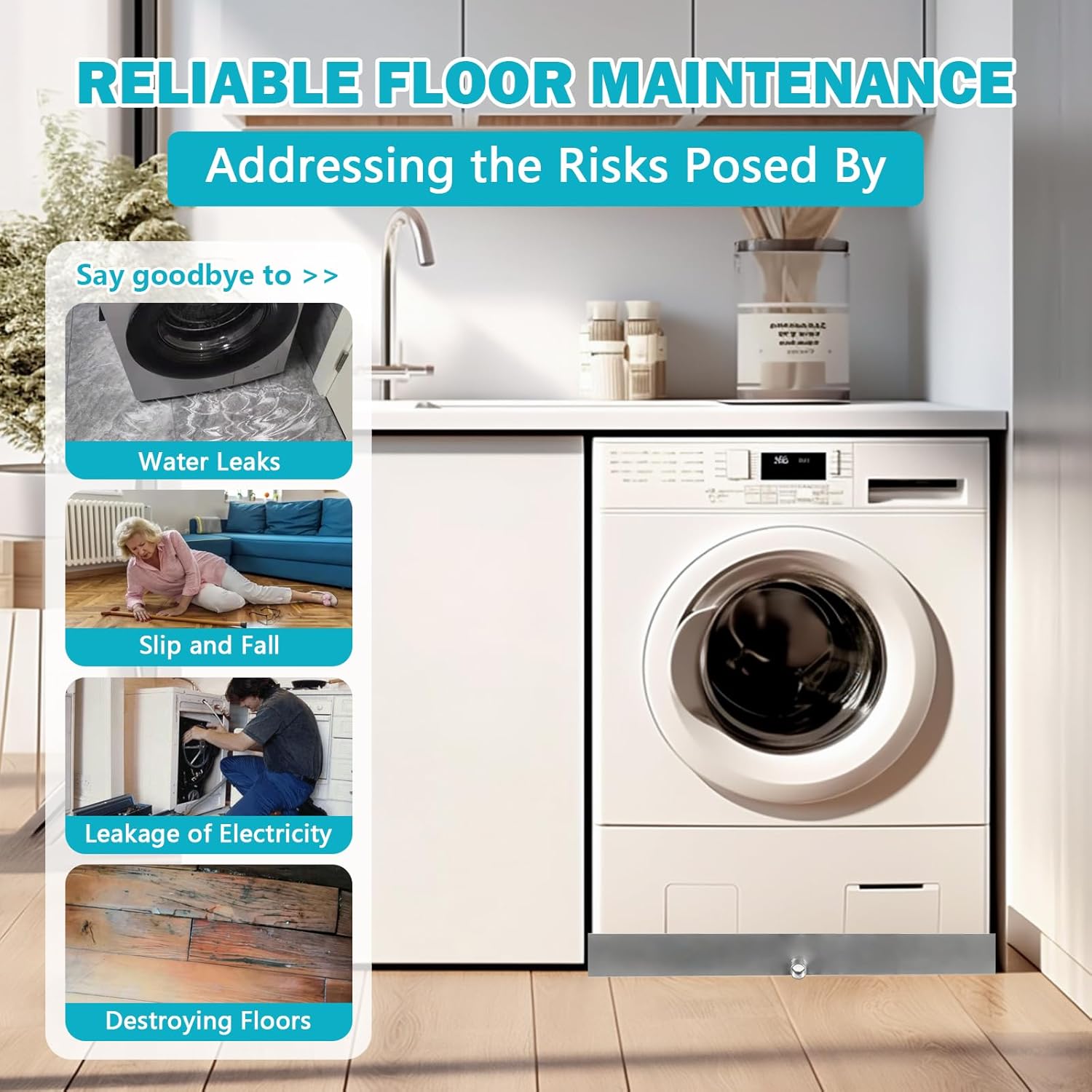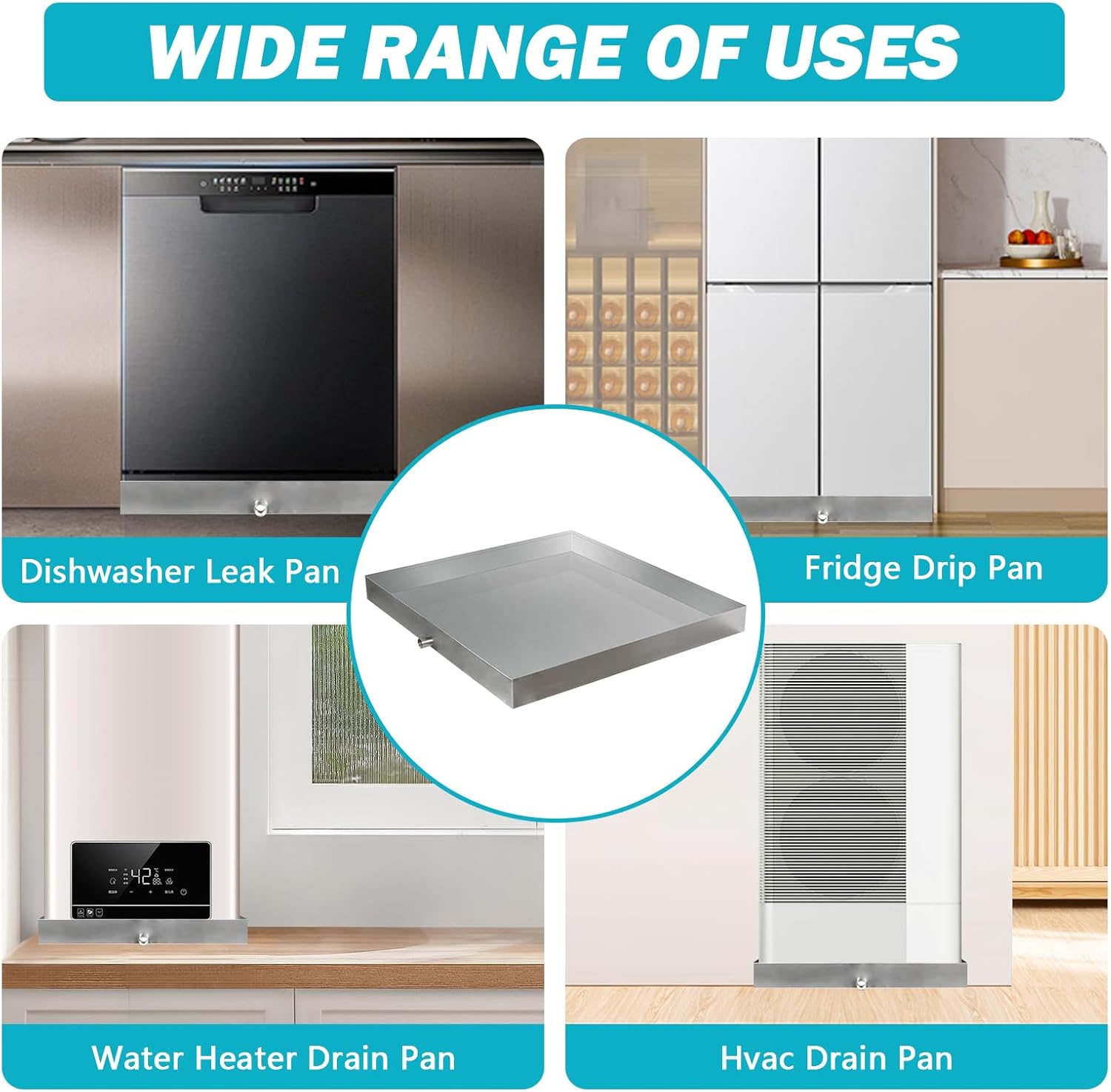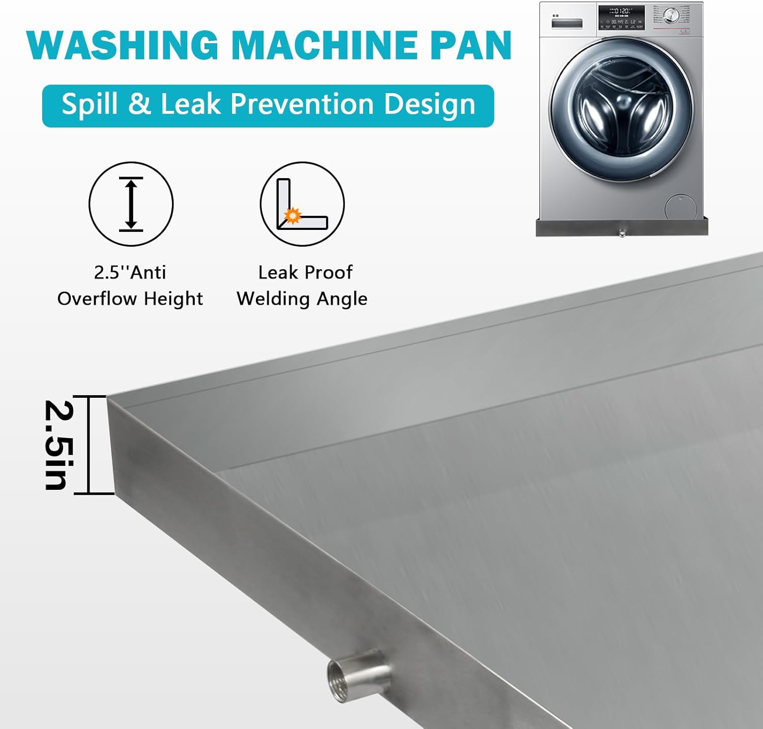 [Stainless Steel Material] The pan for under washing machine is made of 304 stainless steel. This washing machine drain pan is durable, rustproof, and corrosion-resistant,capable of withstanding long-term vibration and weight of washing machines.