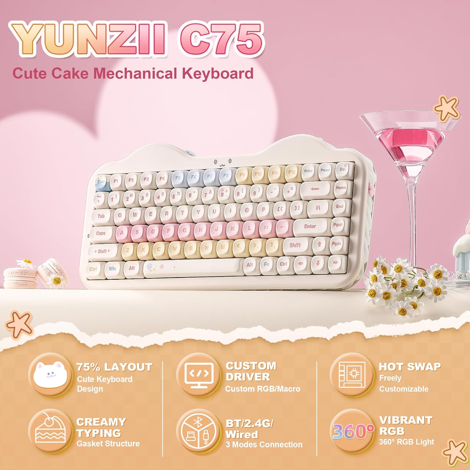 Cute Cake Keyboard 75% LAYOUT: The new YUNZI C75 cute mechanical keyboard series, a sweet addition to desk accessories with colorful keyboard design. Boasting all the beloved features—high-quality mechanical keyboard, compact 75% layout Keyboard, wireless, BT and wired connectivity, and creamy typing sound. This cute wireless gaming keyboard shines as a gift or a charming setup to home, office, workspaces, and gaming stations