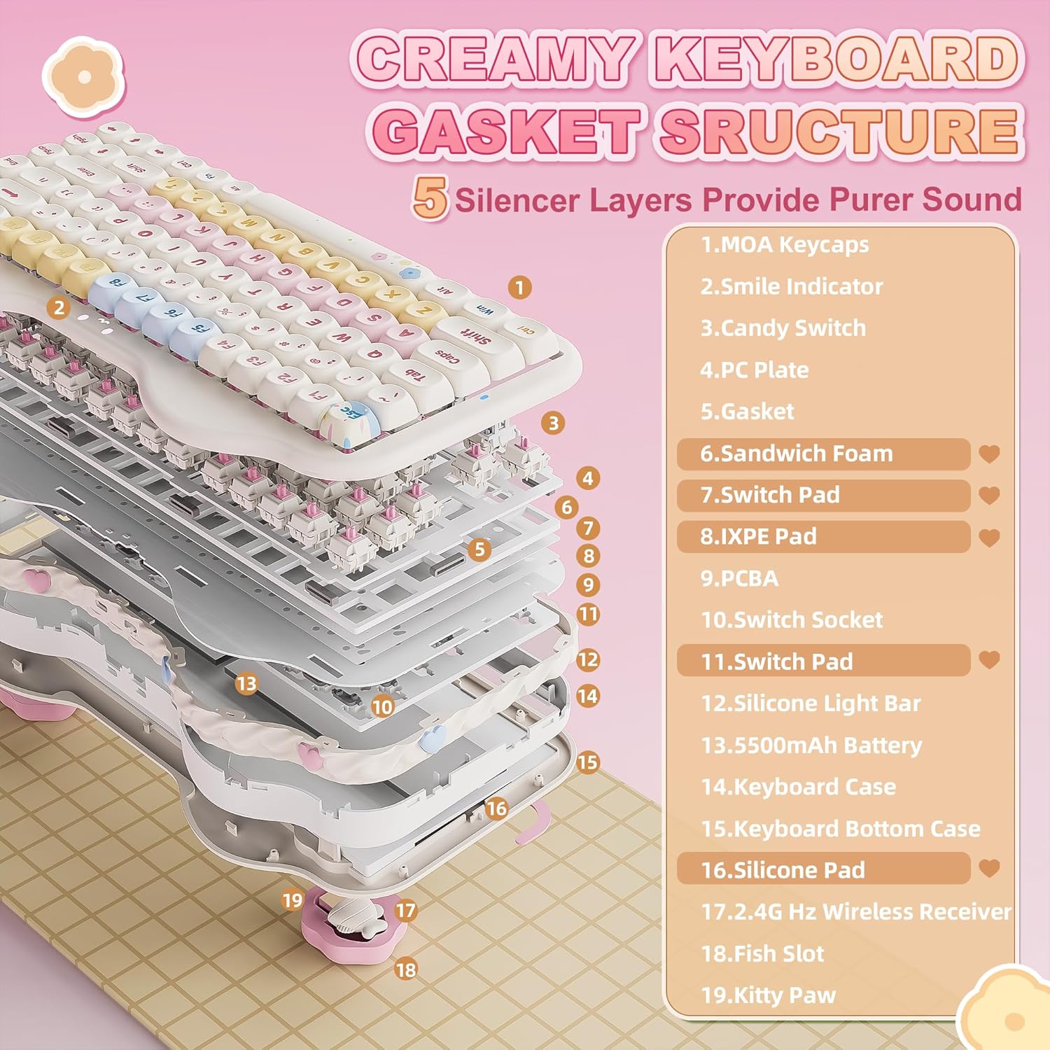 Creamy Keyboard with Gasket Structure: This cute mechanical gaming keyboard takes gasket structure and multiple layers of sound-absorbing fillings, pre-lubed mechanical switches, stabilizers and solid silicone eliminate typing noise, creating a solid creamy mechanical keyboard. Enjoy smooth and consistent keystrokes with a pleasantly Creamy sound of the thocky keyboard that enhances your typing comfort